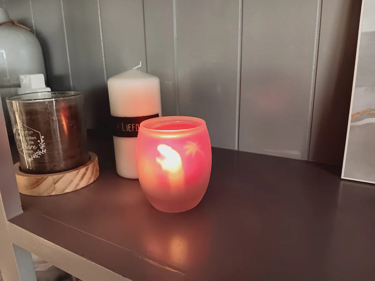 Jozef, maria en de kribbe met de Heiland worden zichtbaar als het waxinelichtje wordt aangestoken. Het flikkerende licht van de kaars geeft een leuk beeld waar je naar blijft kijken.