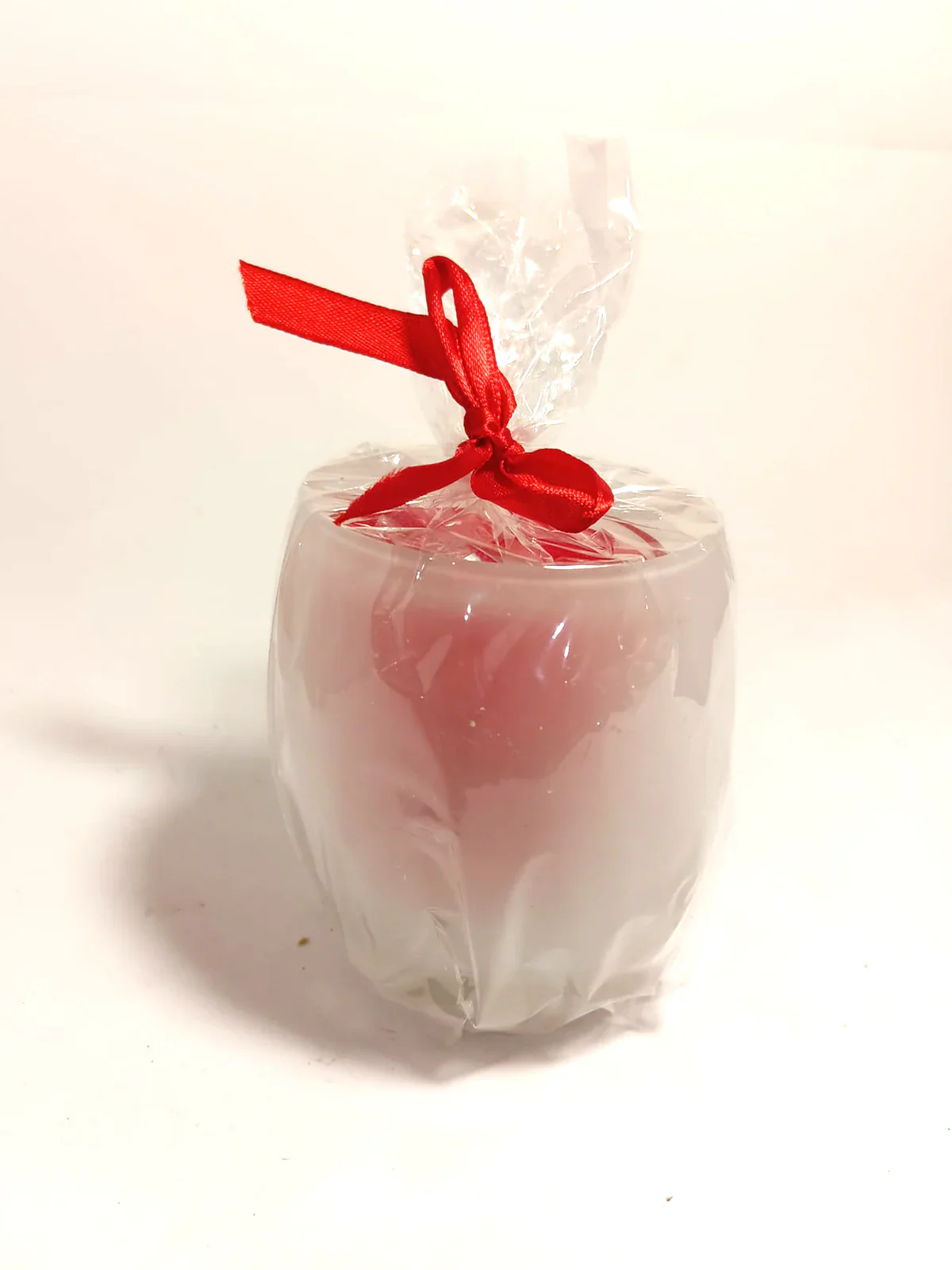 Verpakt per stuk in doorzichtig plastic met rode strik, inclusief waxinelichtje.