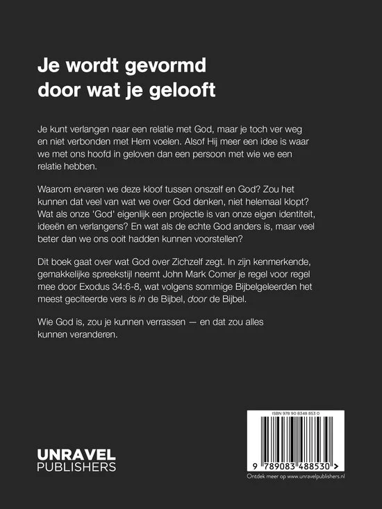 Je wordt gevormd door wat je gelooft. Je kunt verlangen naar een relatie met God, maar je toch ver weg en niet verbonden met Hem voelen. Alsof Hij meer een idee is waar we met ons hoofd in geloven dan een persoon met wie we een relatie hebben. Waarom ervaren we deze kloof tussen onszelf en God? Zou het kunnen dat veel van wat we over God denken, niet helemaal klopt? Wat als onze ‘God’ eigenlijk een projectie is van onze eigen identiteit, ideeën en verlangens? En wat als de echte God anders is, maar veel beter dan we ons ooit hadden kunnen voorstellen? Dit boek gaat over wat God over Zichzelf zegt. In zijn kenmerkende, gemakkelijke spreekstijl neemt John Mark Comer je regel voor regel mee door Exodus 34:6-8, wat volgens sommige Bijbelgeleerden het meest geciteerde vers is in de Bijbel, door de Bijbel. Wie God is, zou je kunnen verrassen — en dat zou alles kunnen veranderen.