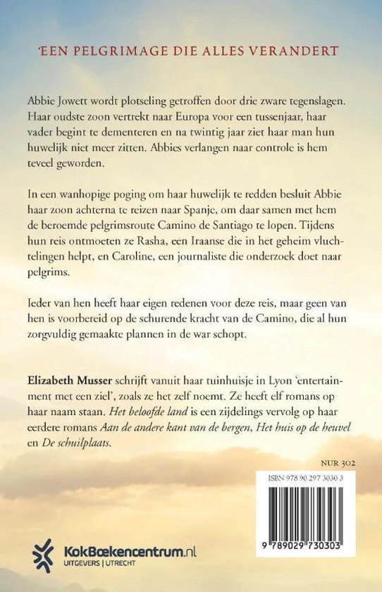 ‘Het beloofde land’ van Elizabeth Musser gaat over drie vrouwen en een wandeltocht die hun leven zal veranderen. Abbie Jowett is overweldigd door de tegenslagen in haar leven. Ze besluit haar volwassen zoon achterna te reizen naar Frankrijk, om daar samen met hem de beroemde pelgrimsroute Camino de Santiago te lopen. Tijdens hun reis ontmoeten ze Rasa, een Iraanse vrouw die in het geheim vluchtelingen helpt, en Caroline, een journaliste die onderzoek doet naar pelgrims. Ieder heeft een eigen reden voor deze ontdekkingsreis, maar geen van hen was voorbereid op de schurende kracht van de Camino, die alles blootlegt en aanspoort tot grondige zelfreflectie.