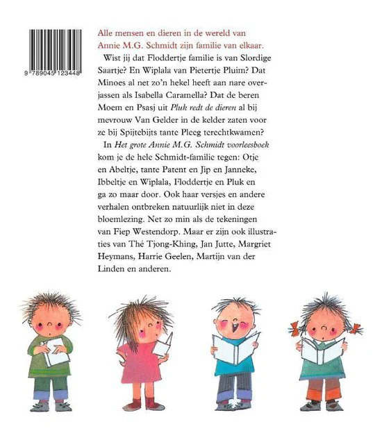 Alle mensen en dieren in de wereld van Annie M.G. Schmidt zijn familie van elkaar. Wist jij dat Floddertje familie is van Slordige Saartje? En Wiplala van Pietertje Pluim? Dat Minoes al net zo’n hekel heeft aan nare overjassen als Isabella Caramella? Dat de beren Moem en Psasj uit Pluk redt de dieren al bij mevrouw Van Gelder in de kelder zaten voor ze bij Spijtebijts tante Pleeg terechtkwamen? In Het grote Annie M.G. Schmidt voorleesboek kom je de hele Schmidt-familie tegen: Otje en Abeltje, tante Patent en Jip en Janneke, Ibbeltje en Wiplala, Floddertje en Pluk en ga zo maar door. Ook haar versjes en andere verhalen ontbreken natuurlijk niet in deze bloemlezing. Net zo min als de tekeningen van Fiep Westendorp. Maar er zijn ook illustraties van Thé Tjong-Khing, Jan Jutte, Margriet Heymans, Harrie Geelen, Martijn van der Linden en anderen.