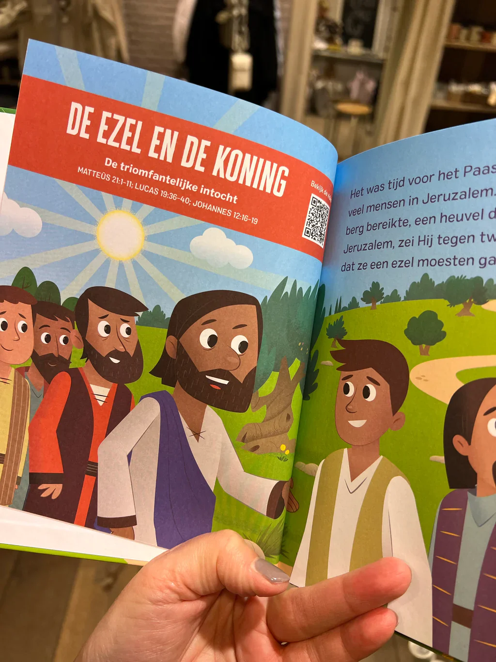 Het Paasverhaal’ is een mooi uitgegeven kinderbijbel met vijf bekende verhalen over de lijdenstijd en opstanding van Jezus, gebaseerd op De Bijbel App voor kinderen (YouVersion). Via QR-codes kun je de verhalen en illustraties tot leven laten komen via de bijbehorende filmpjes en zeer complete App.