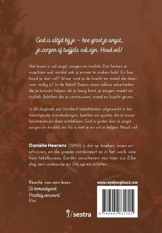 Het leven is vol angst, zorgen en twijfels. Dat herkent vast elke vrouw, want bijna niemand ontkomt eraan. Maar hoe houd je het leven vol als je ermee te maken krijgt? Waar vind je de kracht en moed daarvoor? In de Bijbel! Want daarin staan talloze zekerheden die je kunnen helpen als je bang bent, je zorgen maakt en twijfelt. Beloften die je vertrouwen, moed en kracht geven. In dit dagboek zijn honderd bijbelteksten uitgewerkt in bemoedigende overdenkingen, beelden en quotes, die je eraan herinneren en doen ontdekken: God is groter dan je angst, zorgen en twijfels, en Hij is met je en wil je helpen. Houd vol!