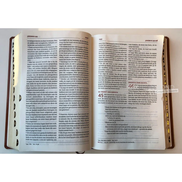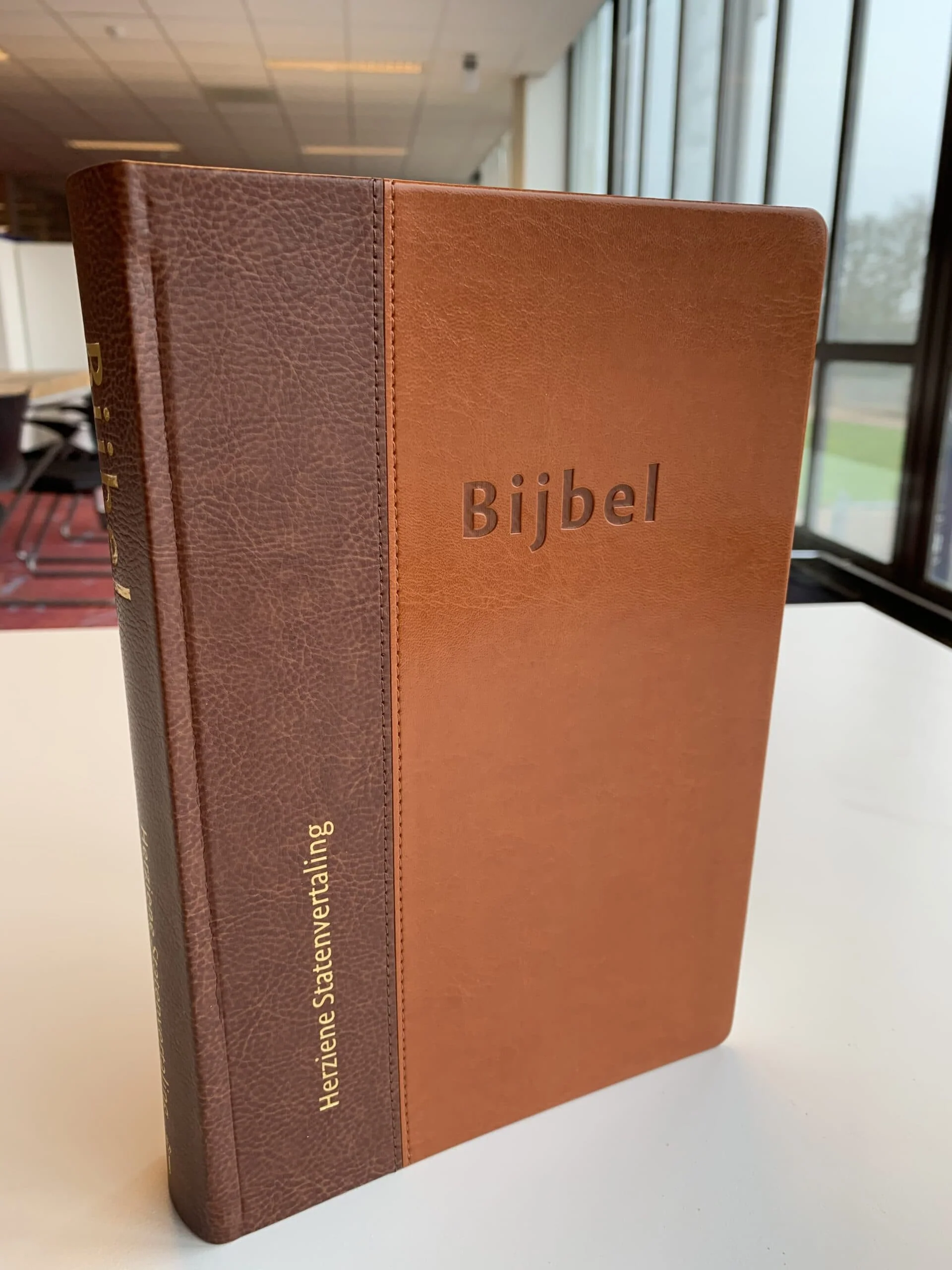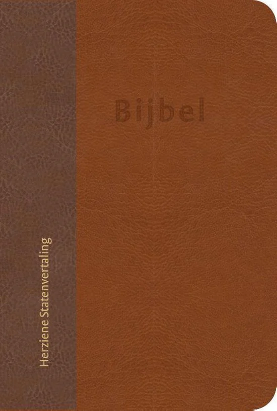 Huisbijbel in Herziene Statenvertaling met flexibele vivella (kunstleren) omslag, goudsnee en duimgrepen.