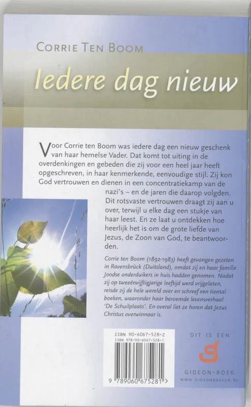 Voor Corrie ten Boom was iedere dag een nieuw geschenk van haar hemelse Vader. Dat komt tot uiting in de overdenkingen en gebeden die zij voor een heel jaar heeft opgeschreven, in haar kenmerkende, eenvoudige stijl. Zij kon God vertrouwen en dienen in een concentratiekamp van de nazi’s ? en de jaren die daarop volgden. Dit rotsvaste vertrouwen draagt zij aan u over, terwijl u elke dag een stukje van haar leest. En ze laat u ontdekken hoe heerlijk het is om de grote liefde van Jezus, de Zoon van God, te beantwoorden.