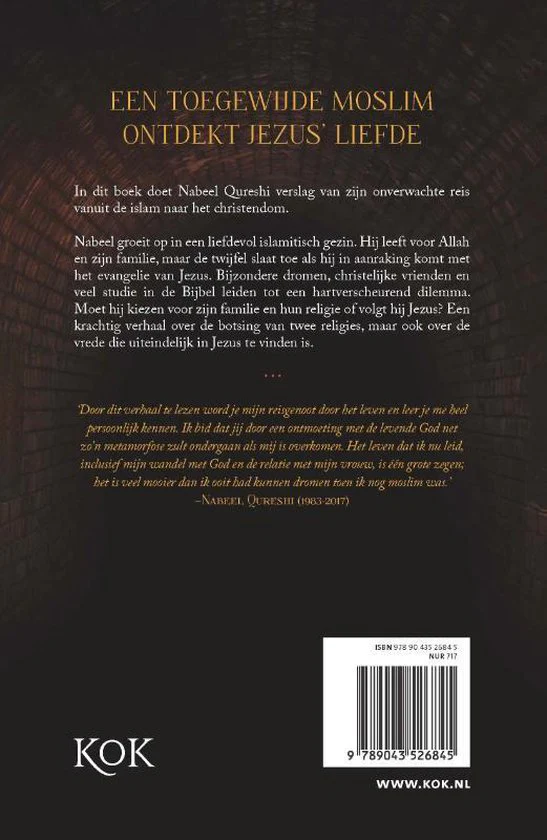 Een nieuwe editie met extra hoofdstukken van ‘Ik zocht Allah en vond Jezus’ van Nabeel Qureshi (1982-2017). Qureshi vertelt in dit boek over zijn bekering tot het christendom. Hij groeit op in een islamitisch gezin, maar dromen, vrienden en veel studie overtuigen hem van de historiciteit van Jezus. Dit boek biedt diepe inzichten in de islam en in de innerlijke strijd van een moslim die zoekt naar de waarheid. Nu met een nawoord van zijn vriend Mark Mittelberg, een terugblik van zijn echtgenote Michelle Qureshi en een gesprek tussen David Wood en Nabeel Qureshi.