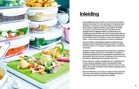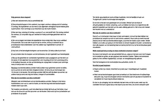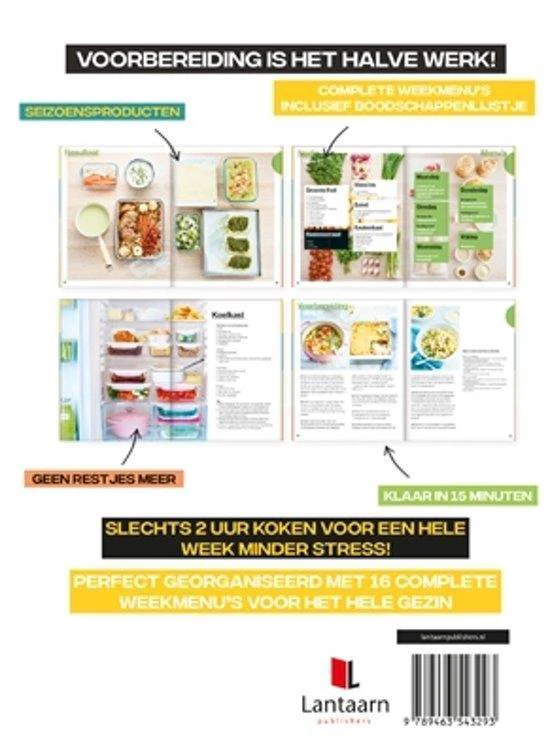 Van maandag- tot en met vrijdagavond geen zorgen meer over wat je nu weer moet eten en of je nog boodschappen moet doen? Veel gerechten te gelijk koken is de oplossing, dat is meal prepping. Met deze methode bespaar je geld, eet je evenwichtig en lekker en het scheelt veel tijd s’avonds. Dit boek helpt met hoe je dit het beste kunt aanpakken door middel van 16 gevarieerde en evenwichtige menu’s ingedeeld naar seizoen. De menu’s zijn voor een gezin van vier personen en bestaan uit 7 recepten: 5 hoofdgerechten en 2 voorgerechten. Desserts zijn niet opgenomen in dit boek. In het boek wordt stap voor stap uitgelegd hoe je meal prepping het beste kunt uitvoeren, dus voordat je het weet ben je goed voorbereid en heb je voor de week maaltijden klaarstaan.