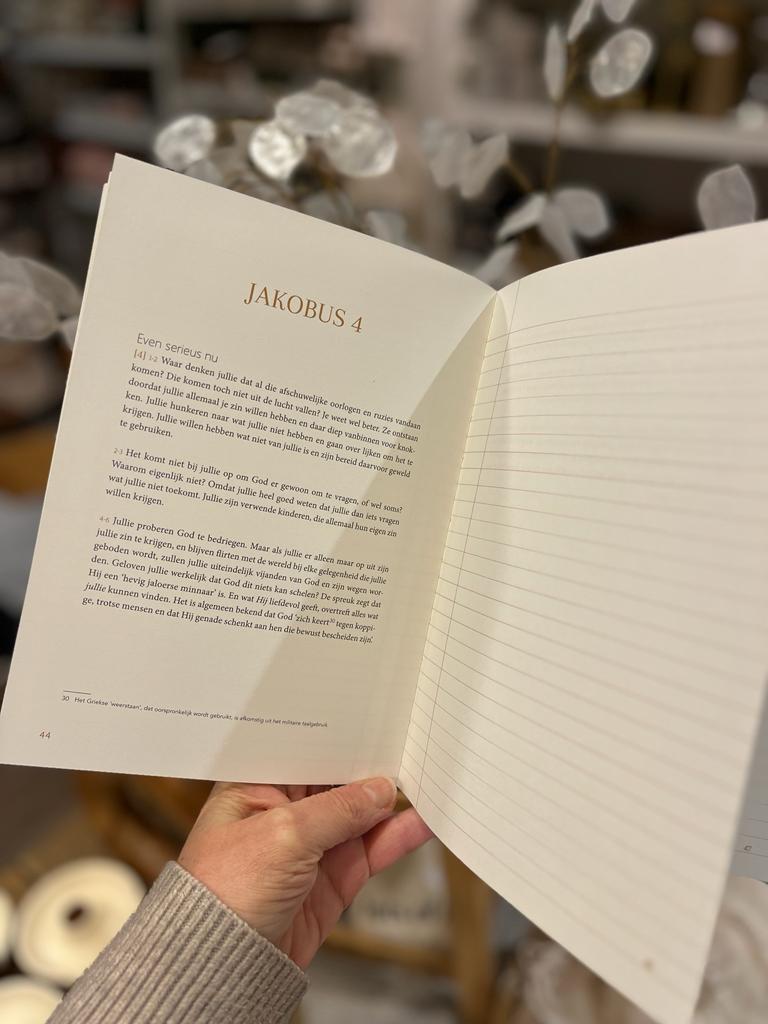 In deze schrijfbijbel vind je de Jakobusbrief in de vertaling van The Message, mét kanttekeningen vanuit de grondtekst. Op elke linkerpagina de Bijbeltekst, op elke rechterpagina ruimte voor jou, zodat jij – op een manier die bij jou past – kunt verwerken wat God vanuit deze brief tot jou te zeggen heeft.