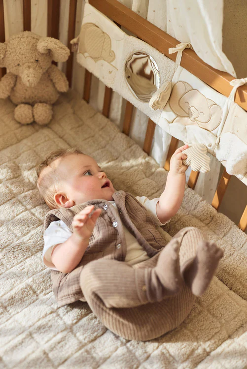 Dit baby speelgoed heeft neutrale kleuren. Zand en offwhite tinten, perfect passend bij elk sad beige interieur.