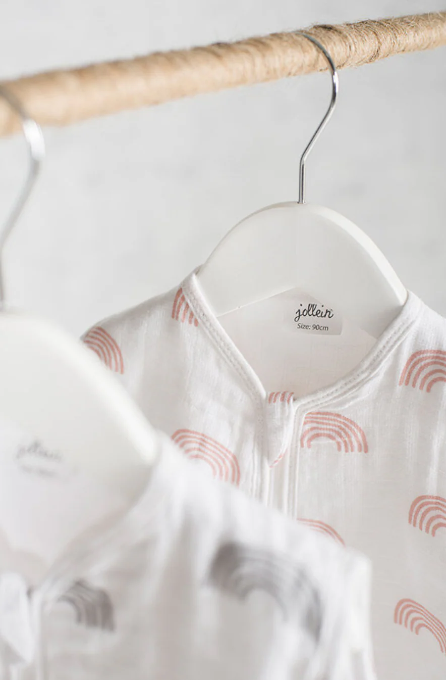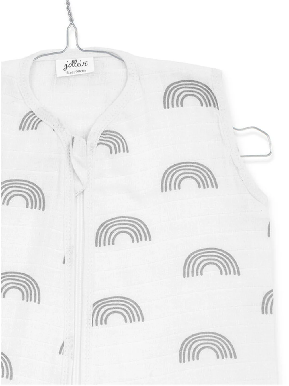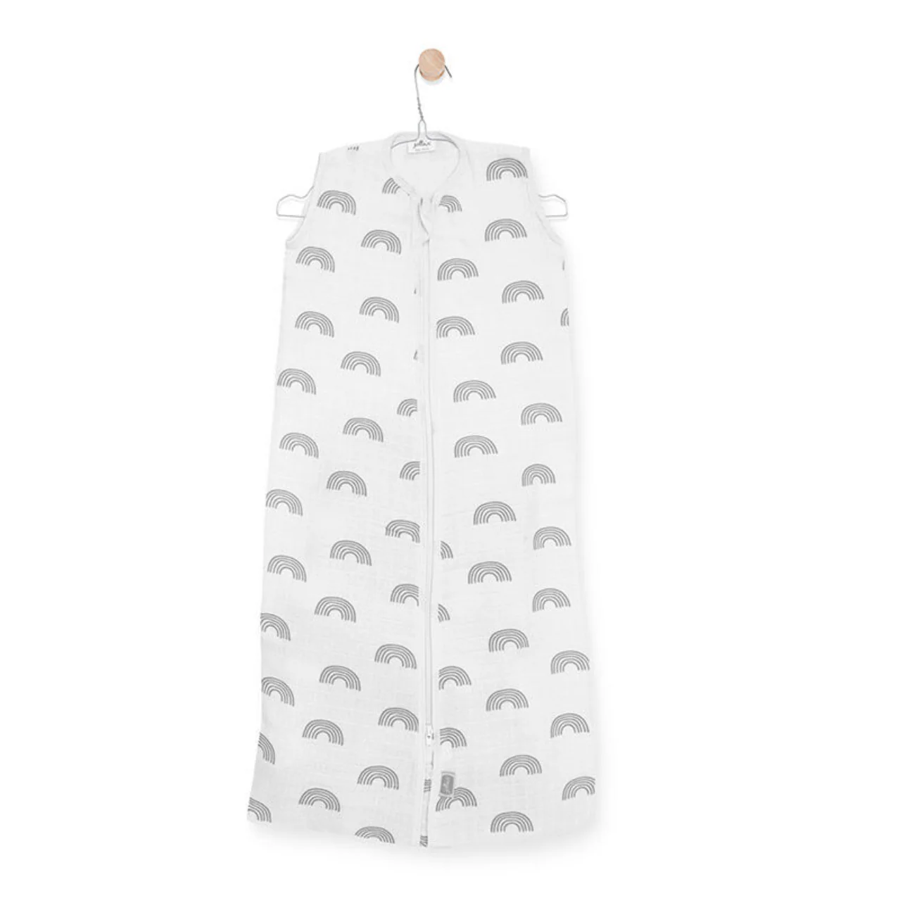 Mooie baby slaapzak van hydrofiel. De slaapzak is verkrijgbaar in roze en grijs met regenboogjes in de maten 70 cm, 90 cm en 110 cm. De slaapzak is gemaakt van 100% katoen en heeft een TOG 0.5