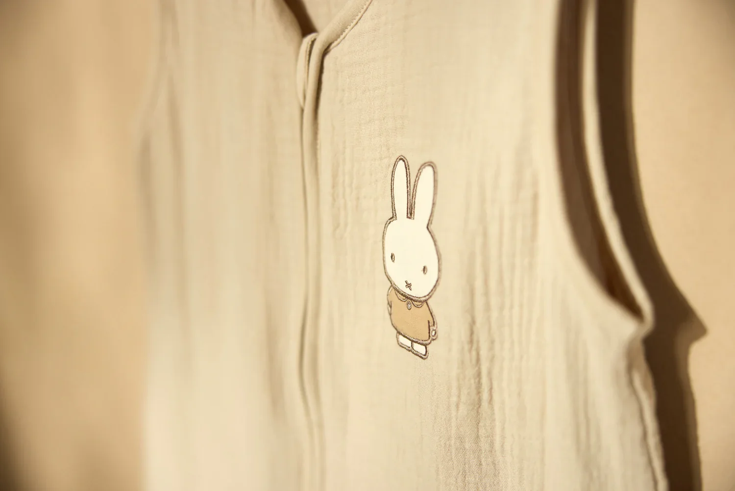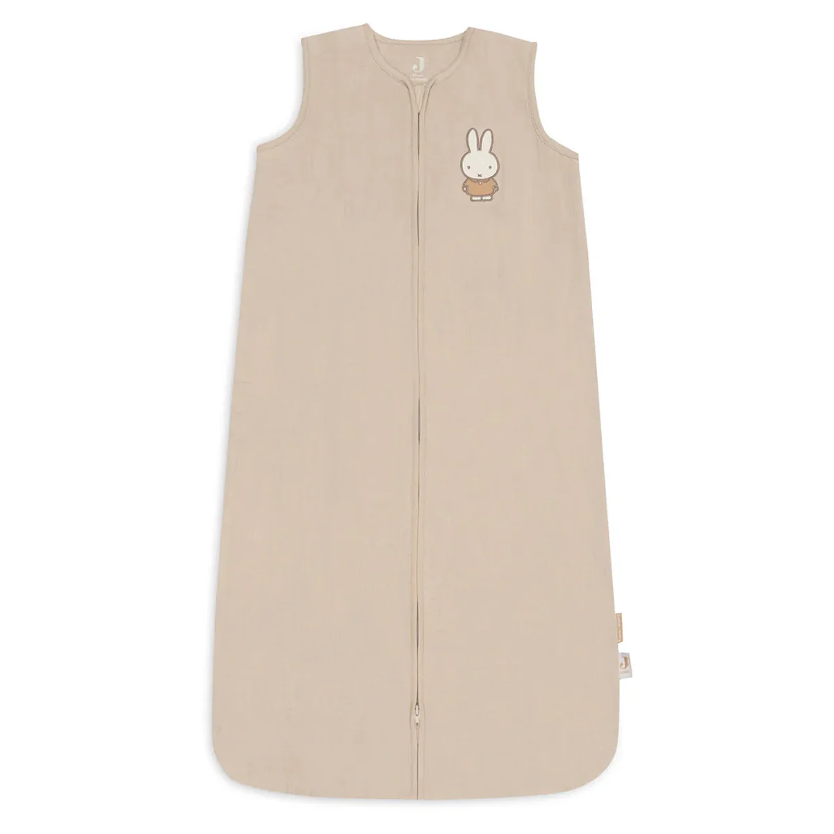Zomer slaapzak voor baby’s, dreumesen en peuters van luchtige hydrofiel stof. Deze beige slaapzak heeft een kleine opdruk van Nijntje en is afkomstig uit het Miffy Family Farm thema van Jollein.