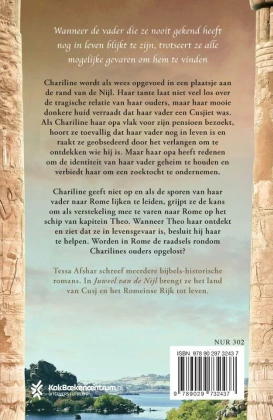 Juweel van de Nijl van Tessa Afshar gaat over Chariline, die als wees wordt opgevoed aan de rand van de Nijl. Haar tante laat niet veel los over de tragische relatie van haar ouders, maar haar mooie donkere huid verraadt dat haar vader een Kushiet was.