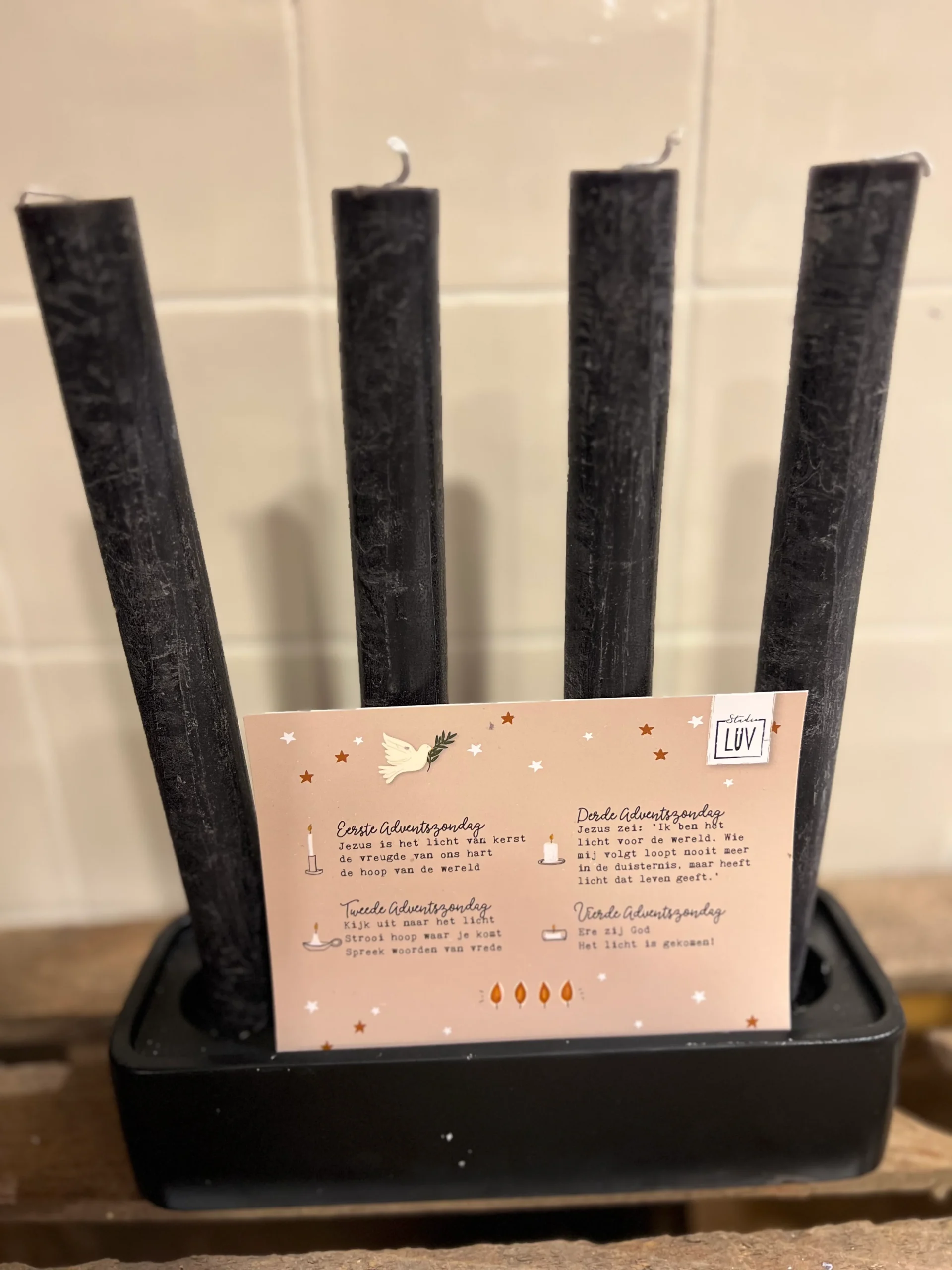 Een prachtige stoere Kaarsenstandaard compleet met 4 kaarsen en incl. de kaart met 4 stilte-momenten voor de 4 Advents-zondagen op weg naar Kerst…