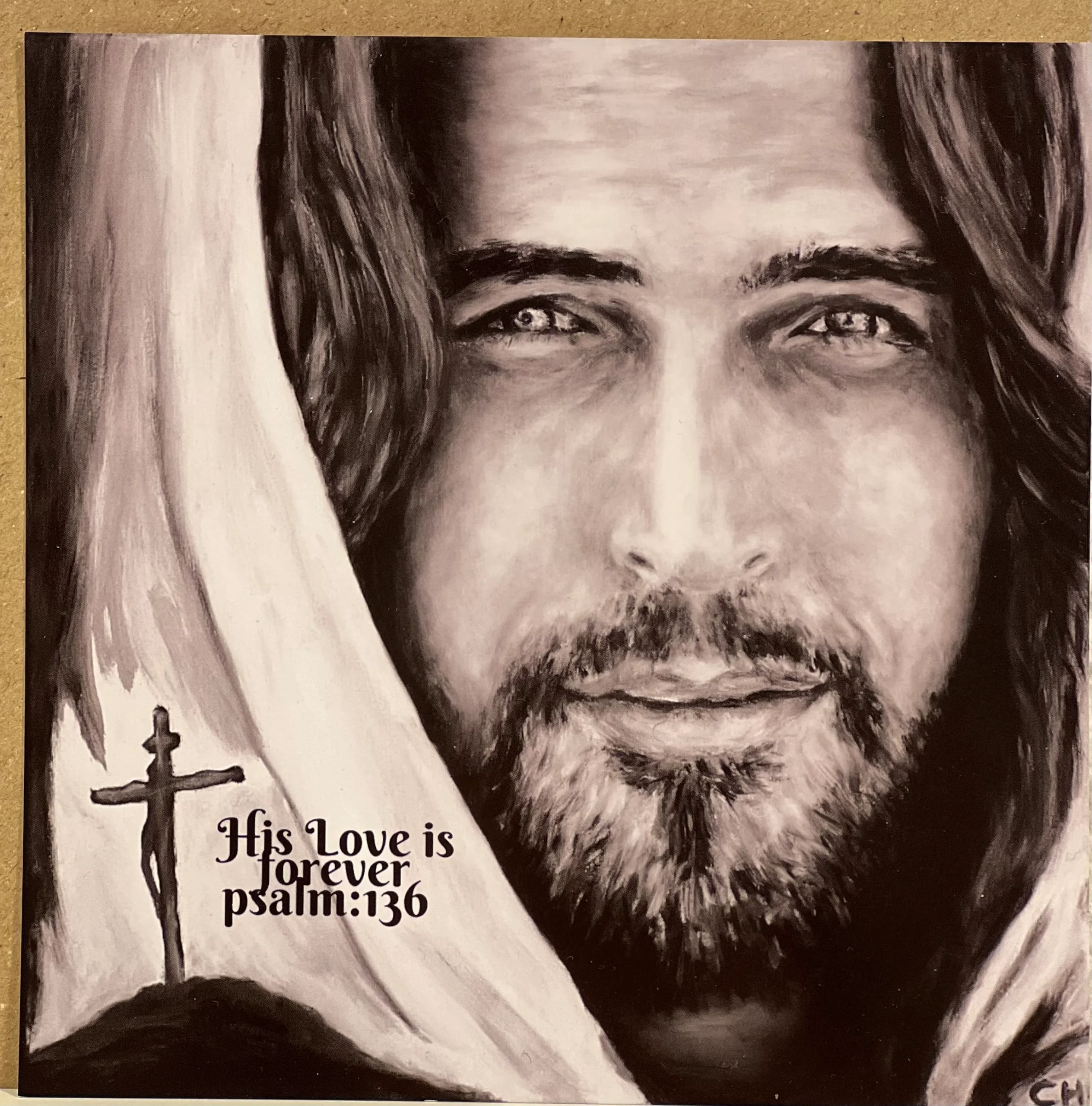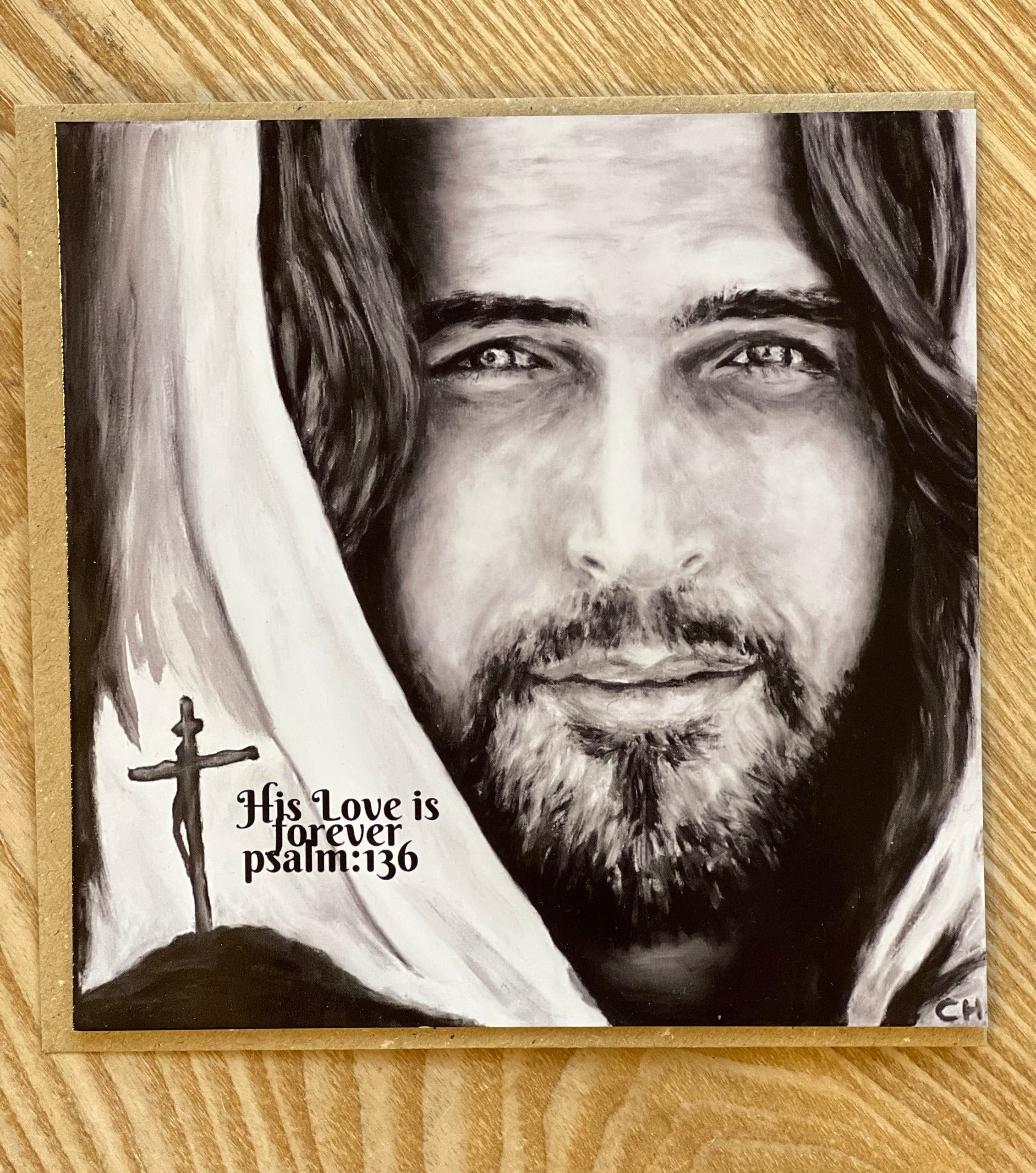 Kaart van een portret van Jezus met de tekst: His love is forever, psalm 136