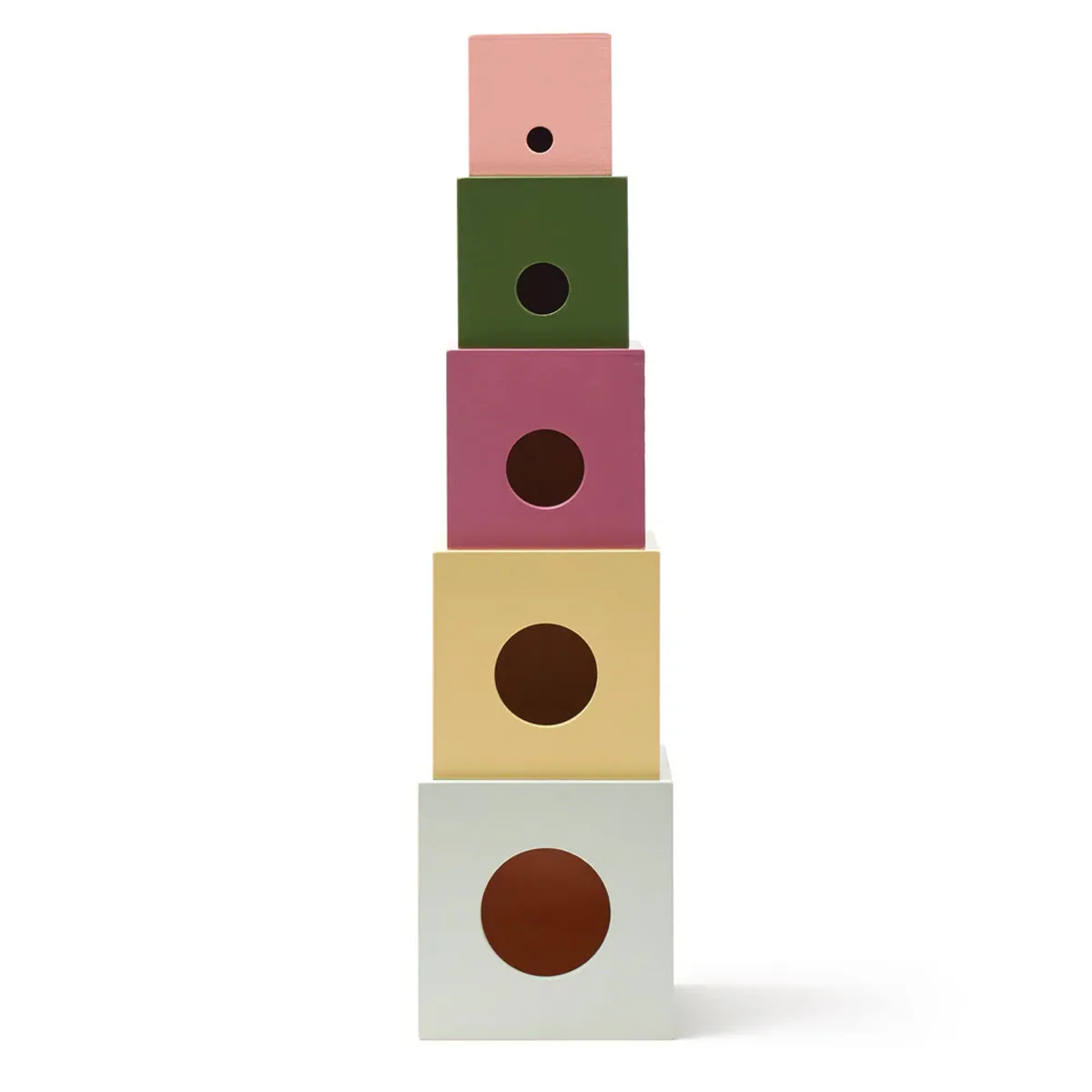 Stapelbare houten kubussen in fijne, rustige kleuren. Kunnen op elkaar of in elkaar gestapeld worden. De kubussen kunnen gesorteerd worden van klein naar groot en omgekeerd. Stimuleert logisch denken, oefent motorische vaardigheden en coördinatie en kan het kind enkele uren bezig houden. Geschikt voor kinderen van alle leeftijden. De kleinste vindt het heerlijk om de blokjes in en uit te peuteren. Oudere kinderen kunnen ze gebruiken als huisje voor hun speelgoeddieren of als opbergdozen, de variaties zijn eindeloos. Elke kubus heeft een gat dat, wanneer het in elkaar wordt gestapeld, een gat door alle kubussen vormt.