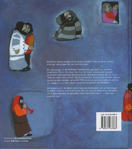 Een zeer geliefd prenten- en voorleesboek voor peuters en kleuters en leesboek voor (jonge) kinderen. Kinderen horen graag uit de bijbel vertellen. Vooral als er mooie, kleurige tekeningen bij het verhaal staan. De tekeningen in de Kijkbijbel hebben iets speciaals: ze spreken boekdelen. Dat is de kunst die Kees de Kort verstaat en met dat artistieke vakmanschap illustreerde hij 28 bijbelverhalen van de serie ‘Wat de bijbel ons vertelt’. Zijn kunstwerken uit de losse boeken zijn nu op een andere manier verwerkt. Met de tekst van alle verhalen zijn ze vormgegeven tot een nieuw, sprankelend geheel: de Kijkbijbel. Een bijbel om in te kijken als je nog niet kunt lezen, om je leeshonger te stillen zodra je wel kunt lezen, om uit voor te lezen of te vertellen als je (groot)ouder of opvoeder bent. Een boek voor… voor wie eigenlijk niet?