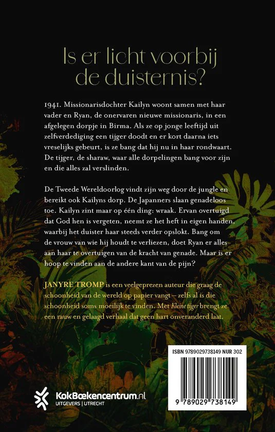 In ‘Kleine tijger’ neemt Janyre Tromp je mee naar het oerwoud van Birma, het huidige Myanmar, ten tijde van de Tweede Wereldoorlog. Als Japan het land binnenvalt, staat de missionarisdochter Kailyn Moran er zo goed als alleen voor. Haar vader is op reis, haar moeder is overleden en haar enige metgezel is Ryan McDonough, de onervaren nieuwe missionaris. Samen doen ze hun best hun dorp zo goed mogelijk te beschermen tegen de vijand.