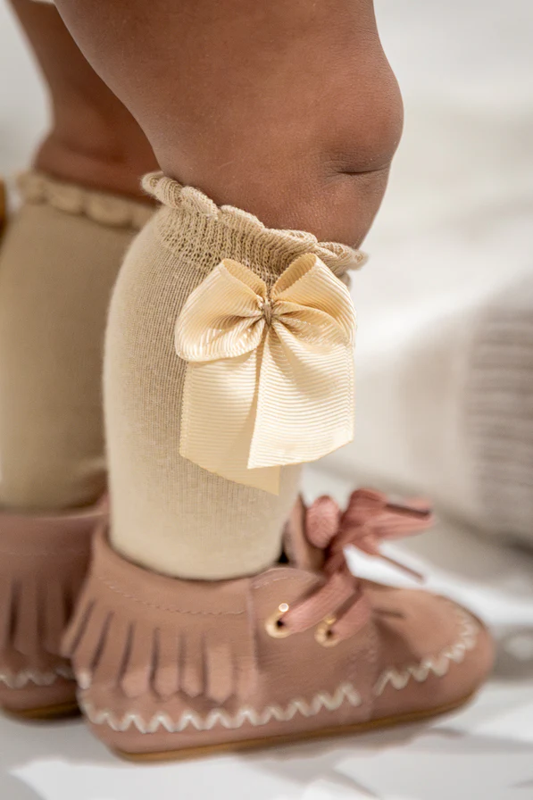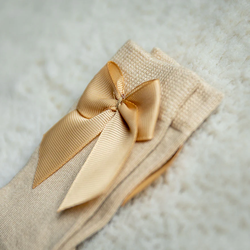 Schattige kniekousen met een strikje voor baby’s en kinderen. De kleur camel is een warme zand kleur en kan met heel veel kleuren outfits gecombineerd worden. Het strikje zit vast gestikt en niet gelijmd. Zo blijft het strikje in de wasmachine ook zitten.