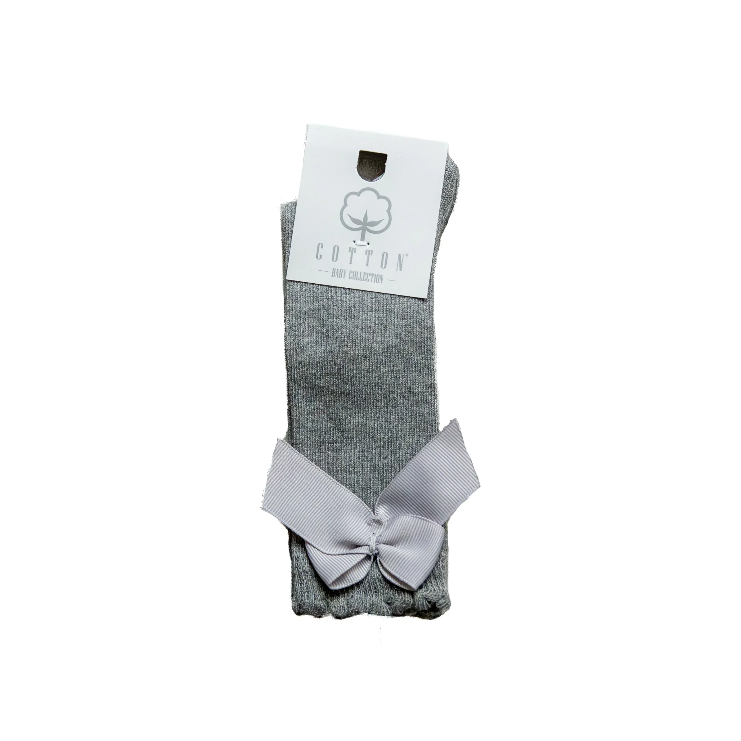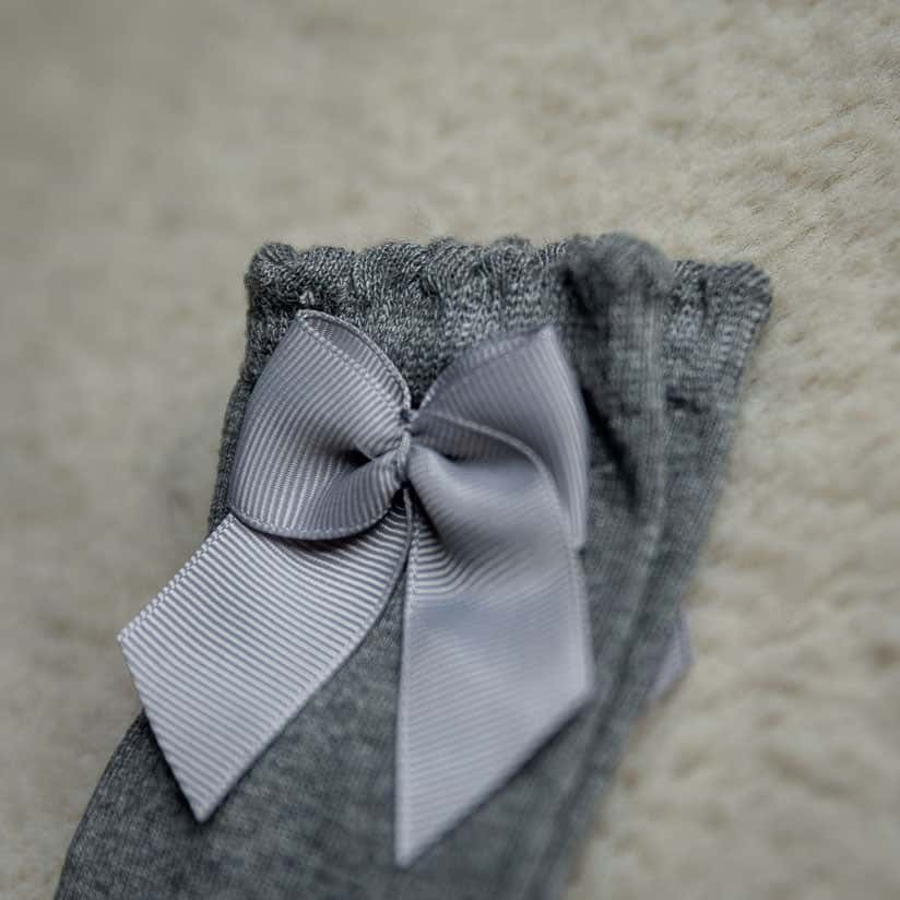 Schattige kniekousen met een strikje voor baby’s en kinderen. De kleur grijs is een mooie kleur voor in het najaar en voorjaar. De strik zit vast gestikt en niet gelijmd, zo blijft het strikje in de wasmachine ook zitten.