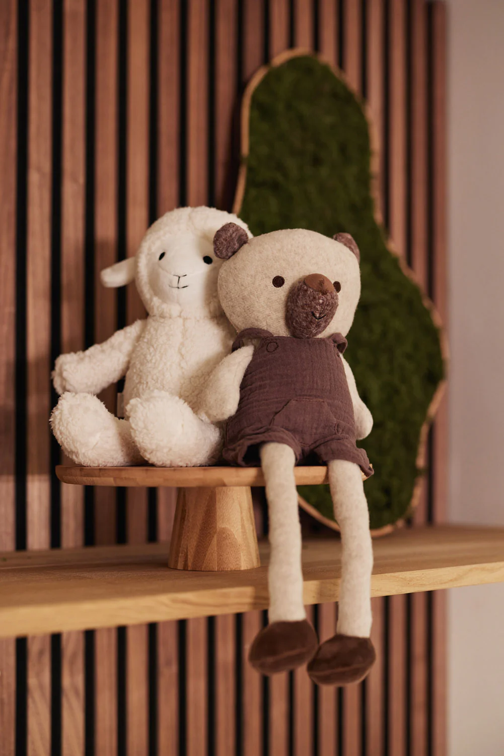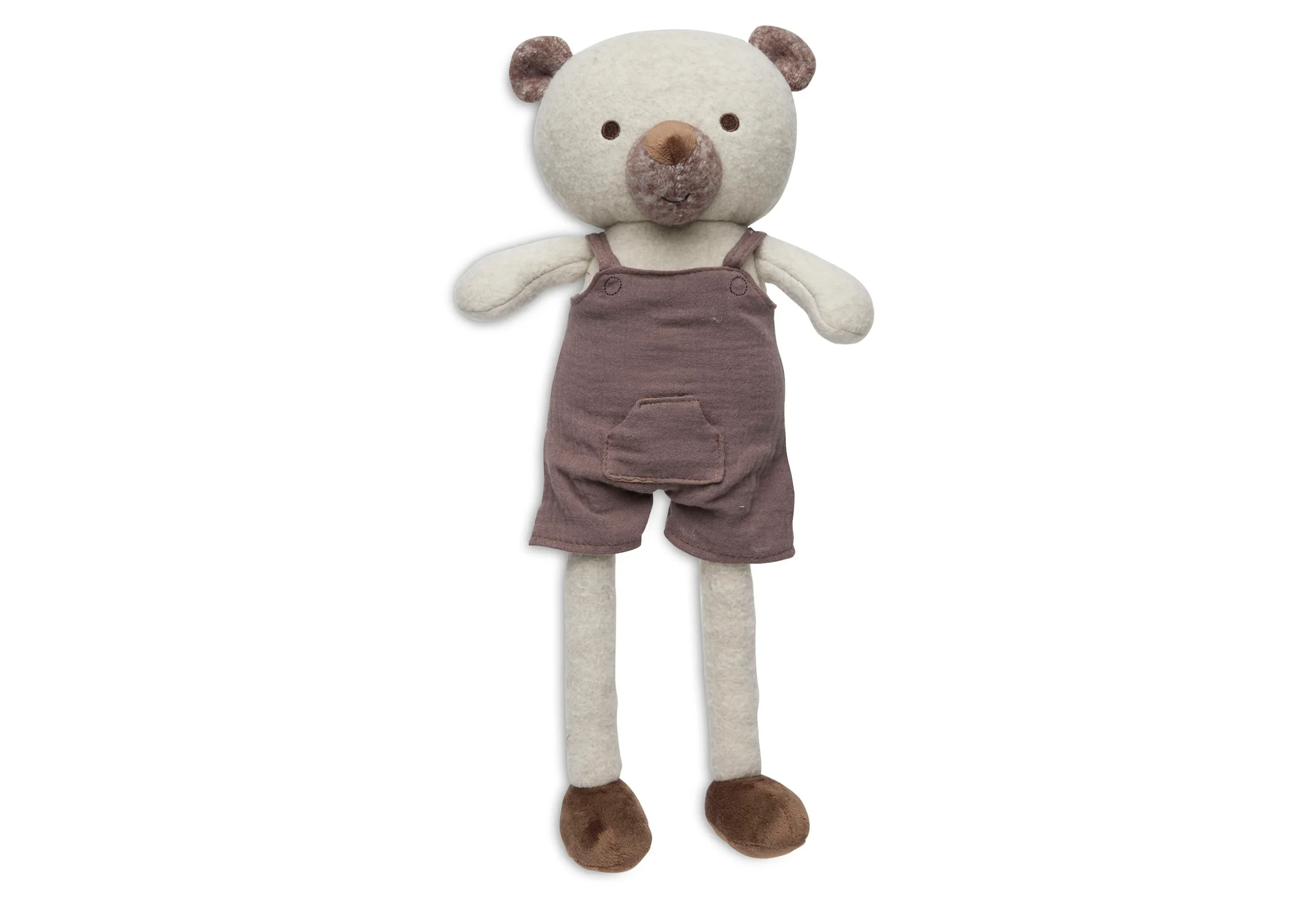 Sam heeft een lief bruin neusje en zachte voetjes van velours. Sam draagt een bruin tuinbroekje van hydrofiele stof. Zijn kleding kan aan- en uit getrokken worden en dat bevordert het fantasiespel van jouw kindje.