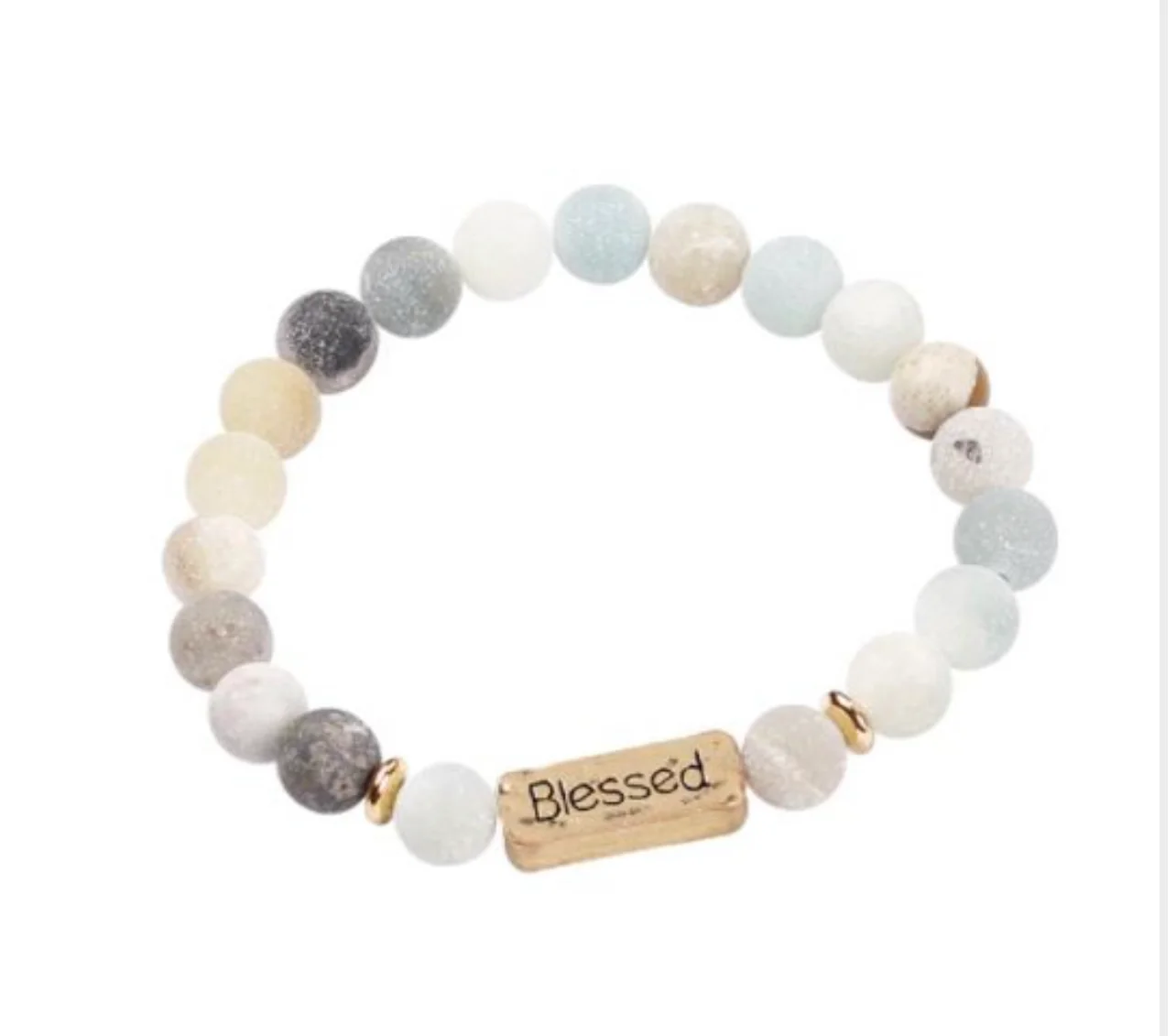 Mooie armbanden vn Natuursteen, met een goudkleurige kraal met de gravure: Blessed