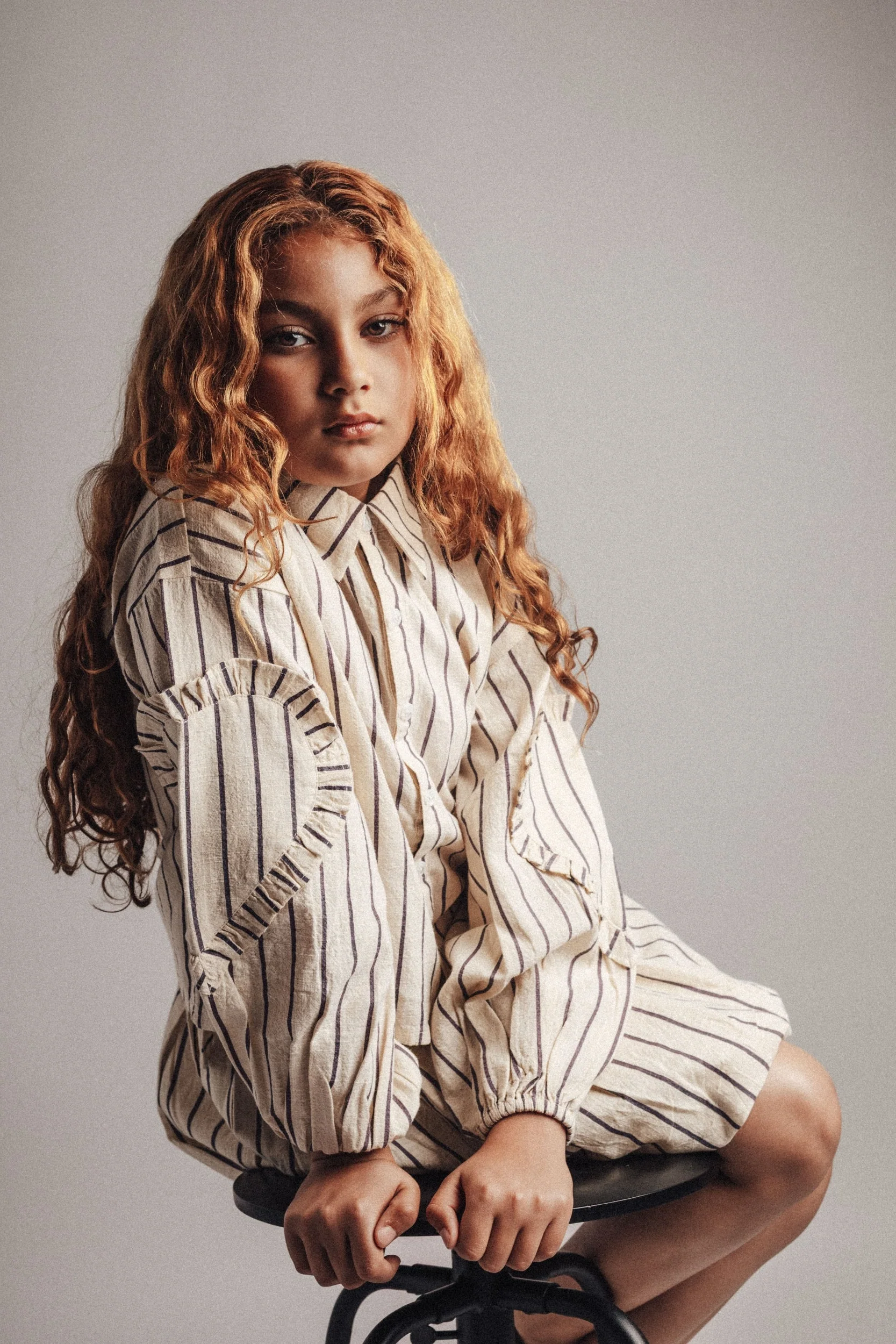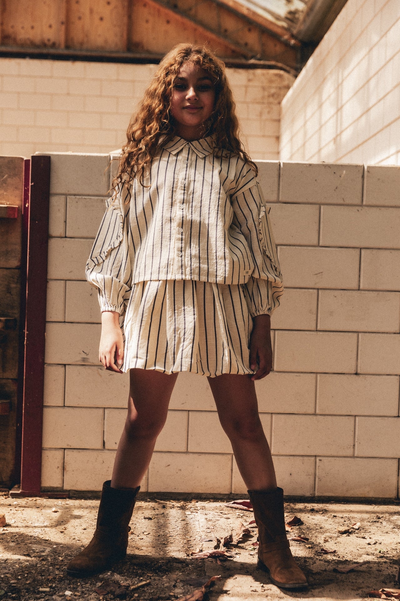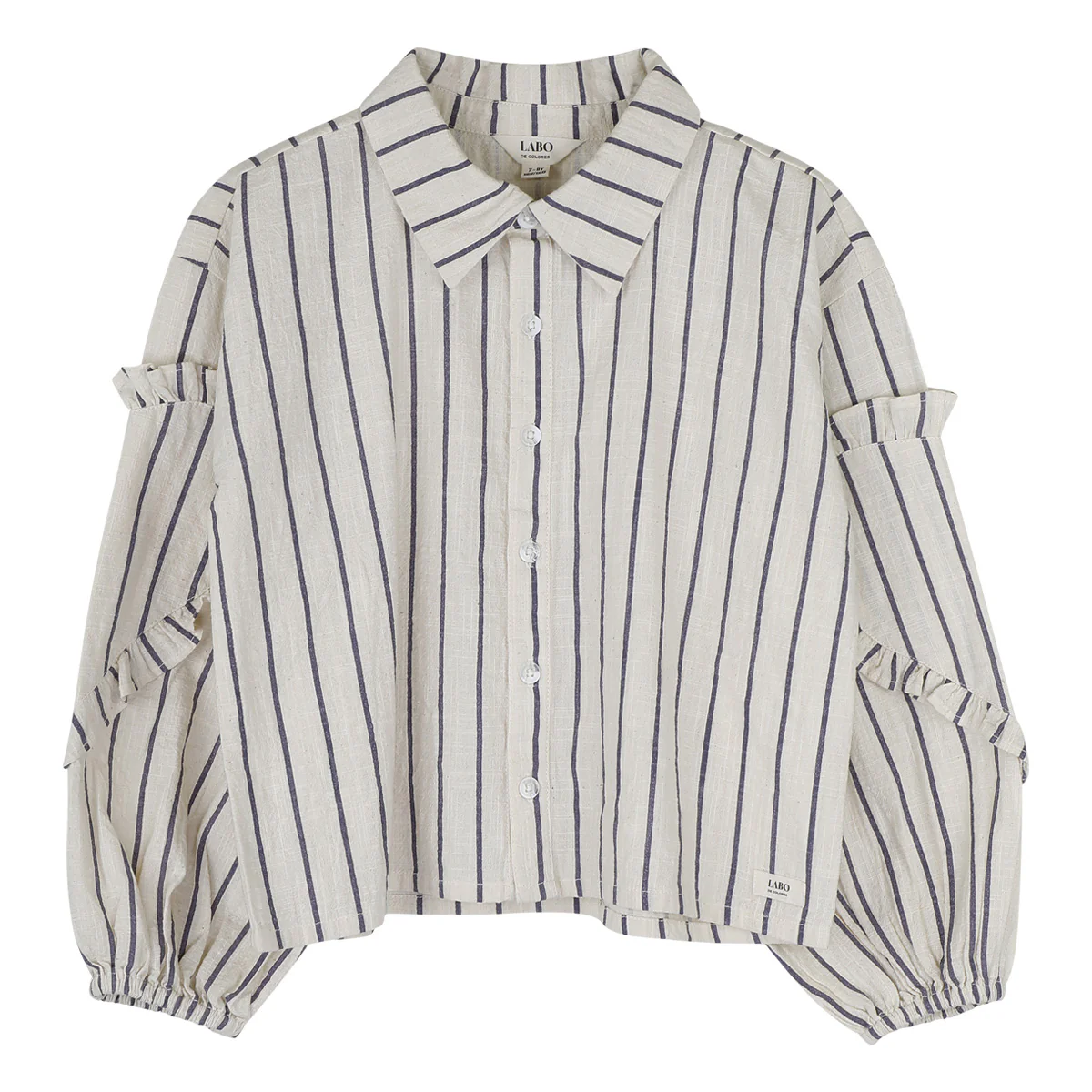 Gestreepte blouse met harten op de mouwen. Blouse Lovee van Labo de Colores heeft een lavender grey verticaal streep patroon. De strepen zijn lavender van kleur, en valt uit als een paarsblauwe tint. De ondergrond van de blouse heeft is een grijzige toon.