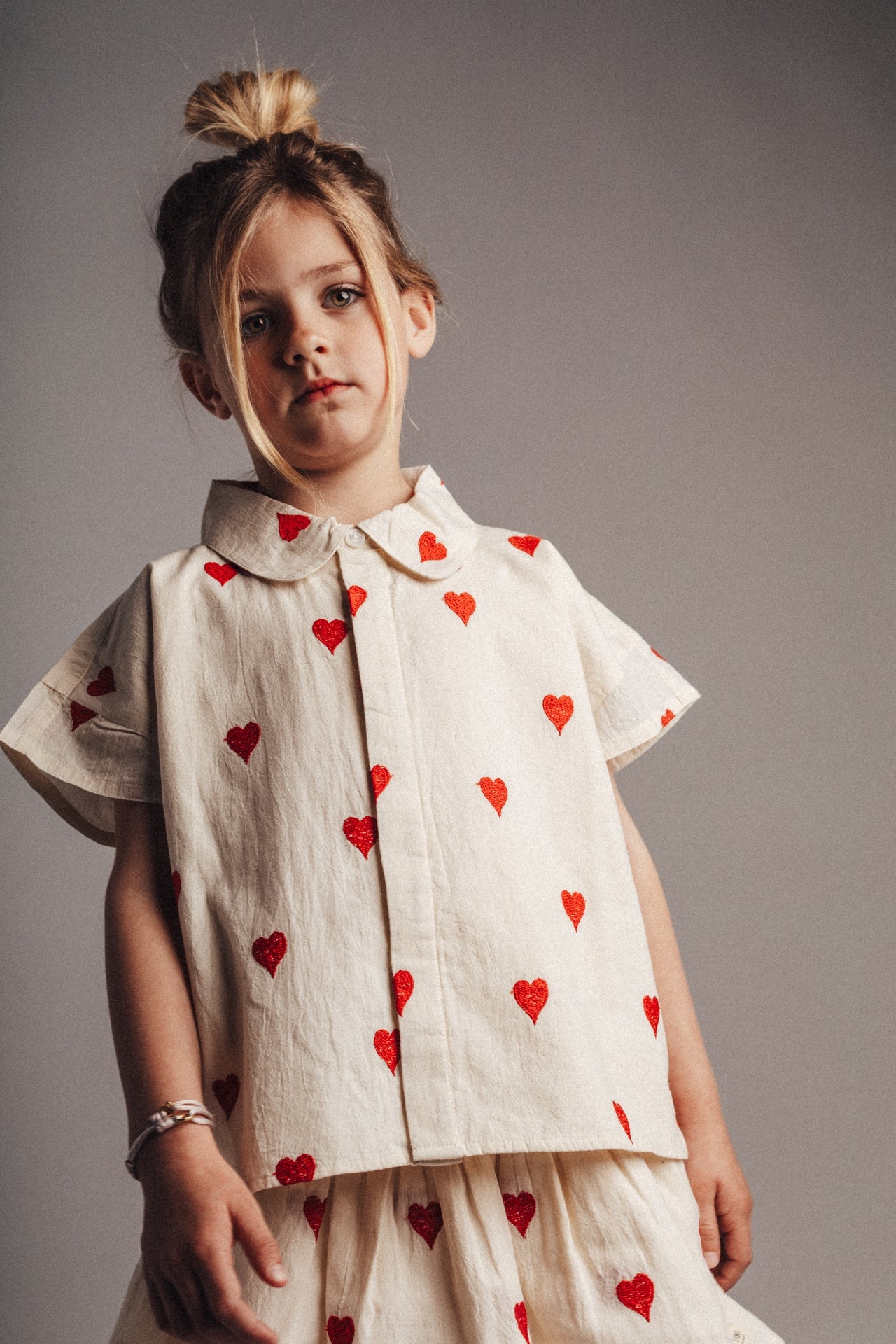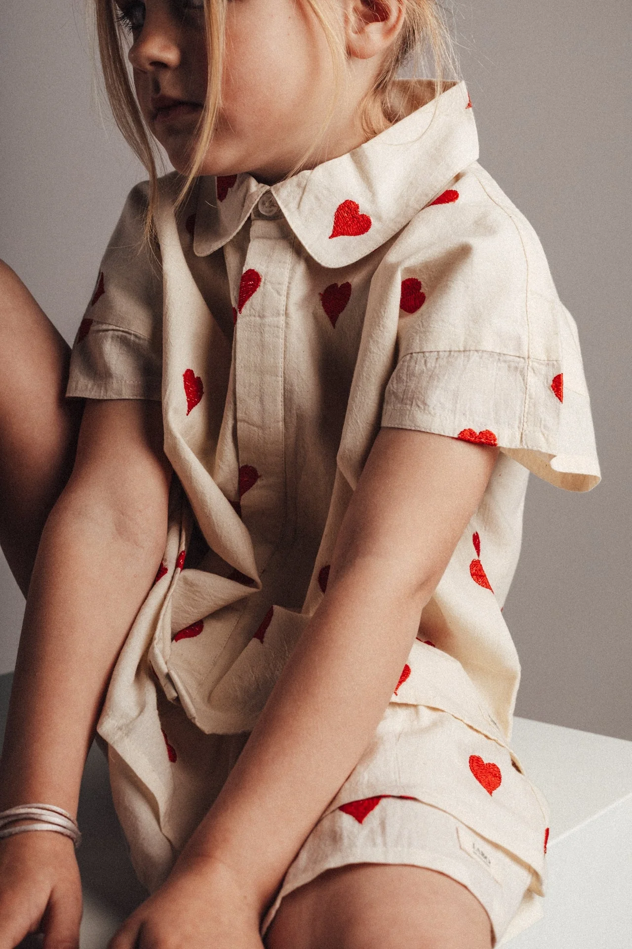 Hartjes blouse van Labo de Colores met korte mouwen. Heerlijk zomers en echt meisjes! De kleur van de blouse is offwhite en de hartjes zijn rood.