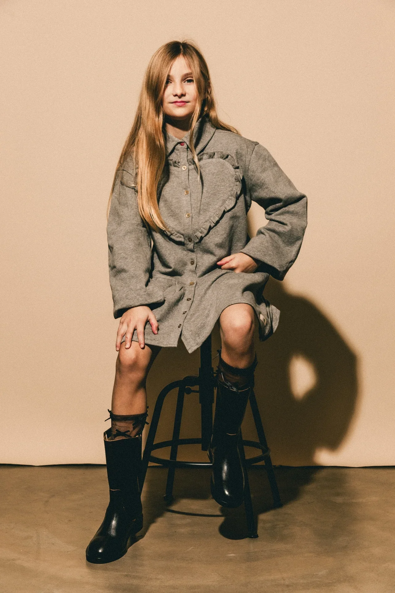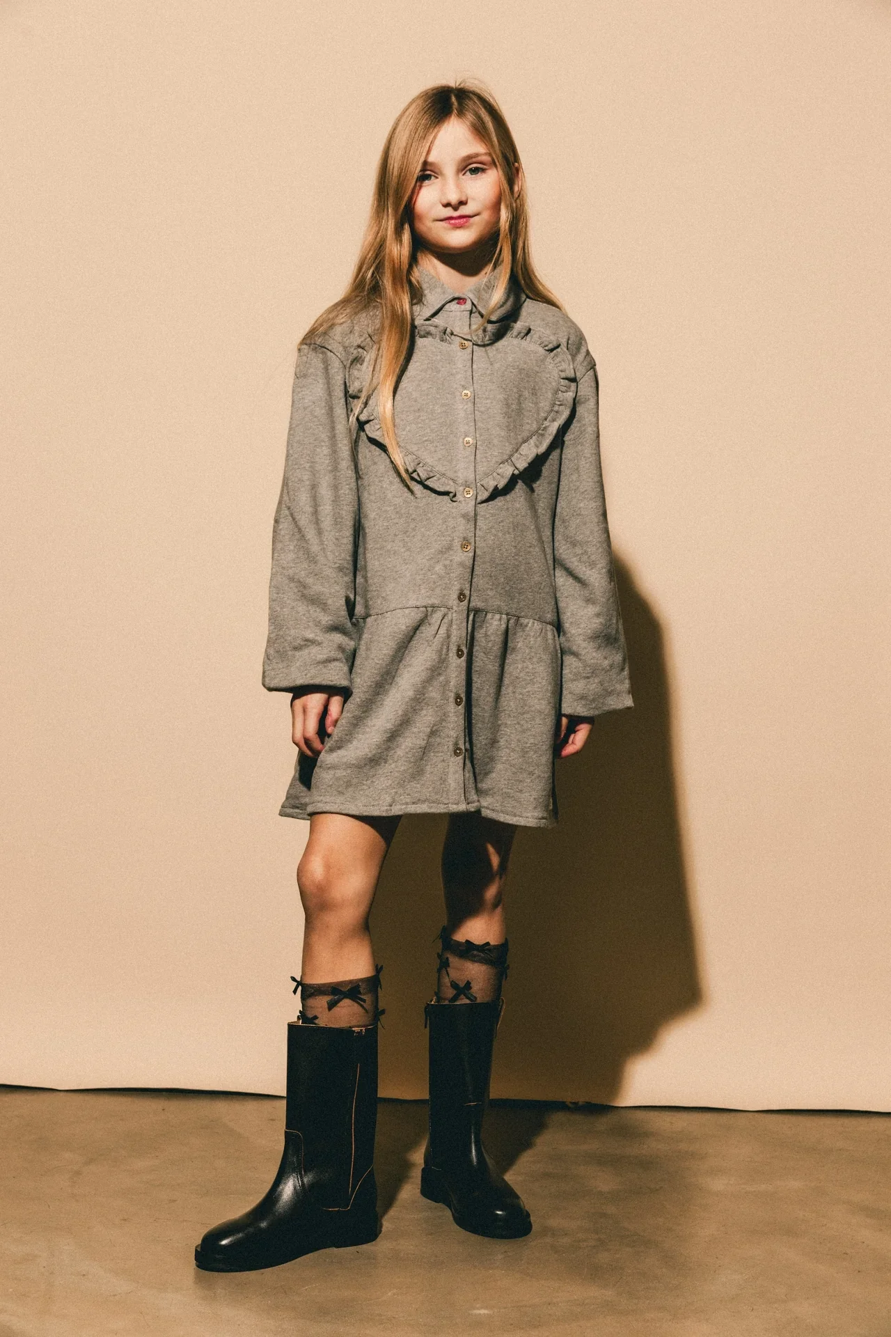Relaxte kinderjurk van Labo de Colores gemaakt van sweat stof. Dress Kabe heeft een speels hartje aan de voorkant. De kleur grey melange is een grijs gemeleerde kleur. De jurk van jogging stof draagt heel relaxt en ziet er duur de afwerking toch luxe uit.