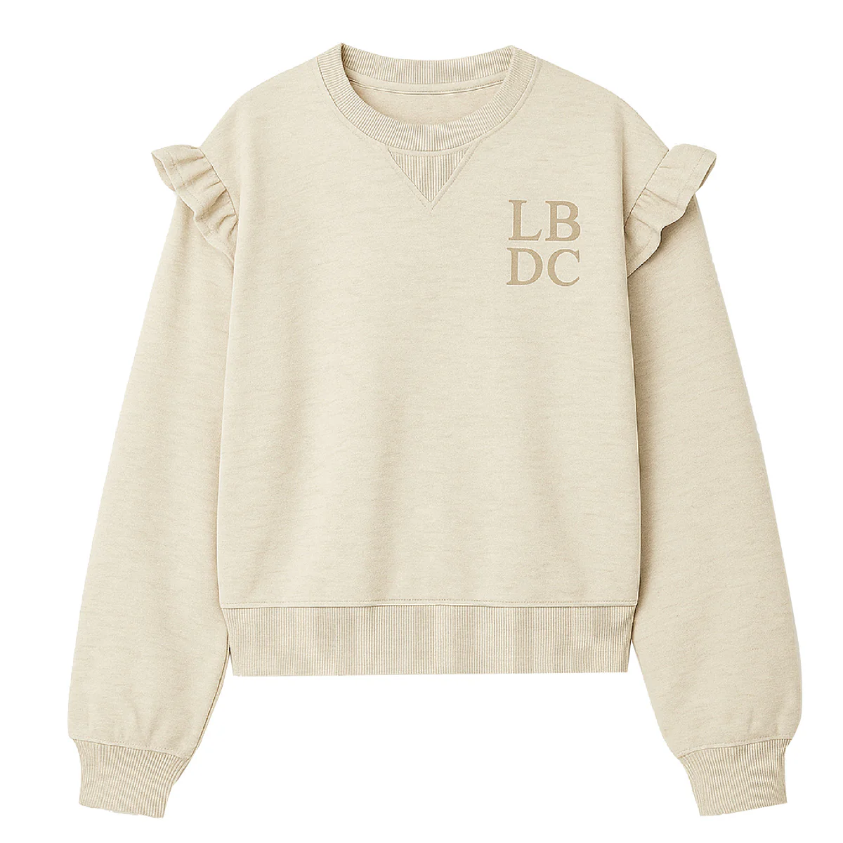 Sweater met ruches bij de schouder en het Labo de Colores LBDC logo. Sweater Loova heeft een beige gemêleerde tint.