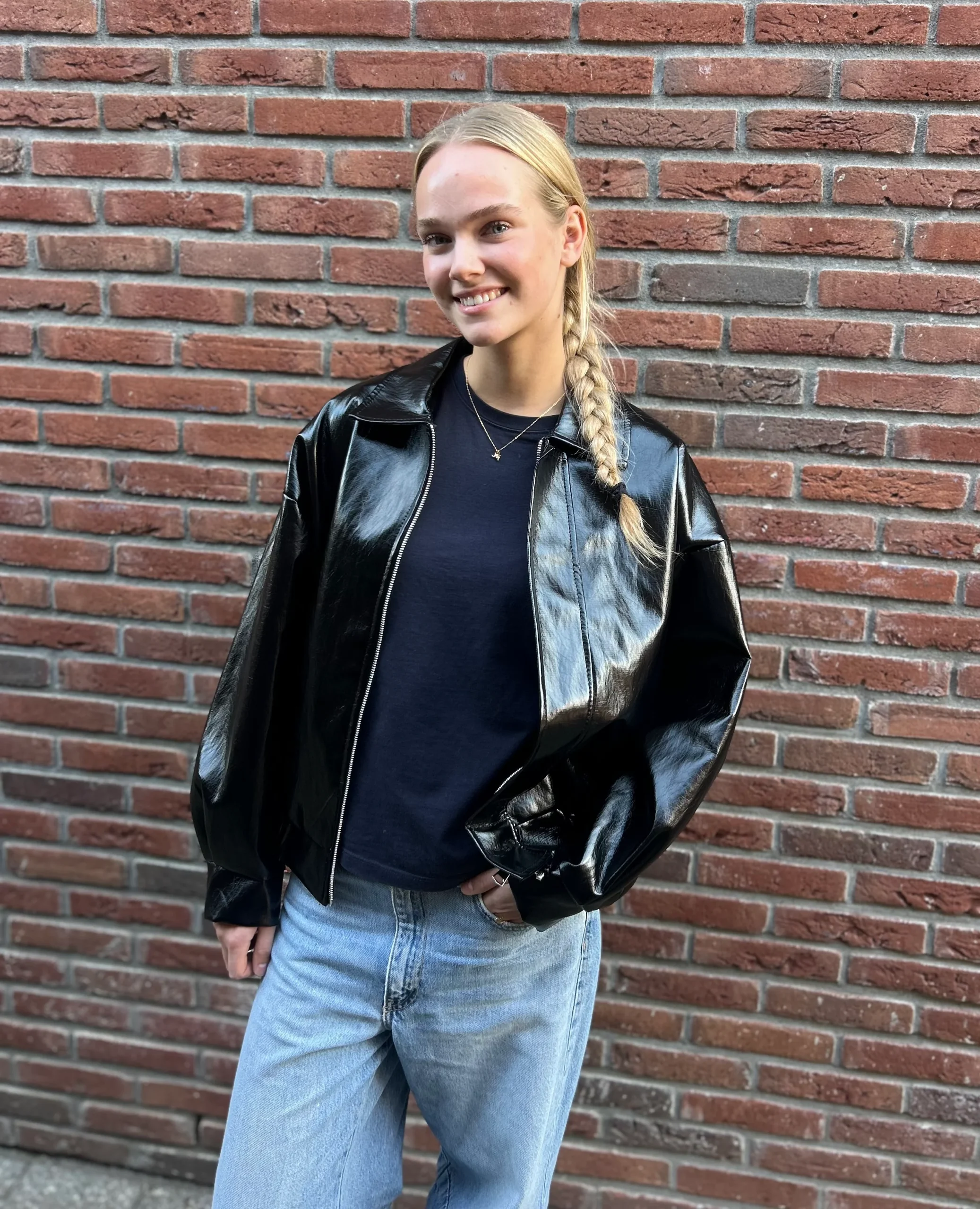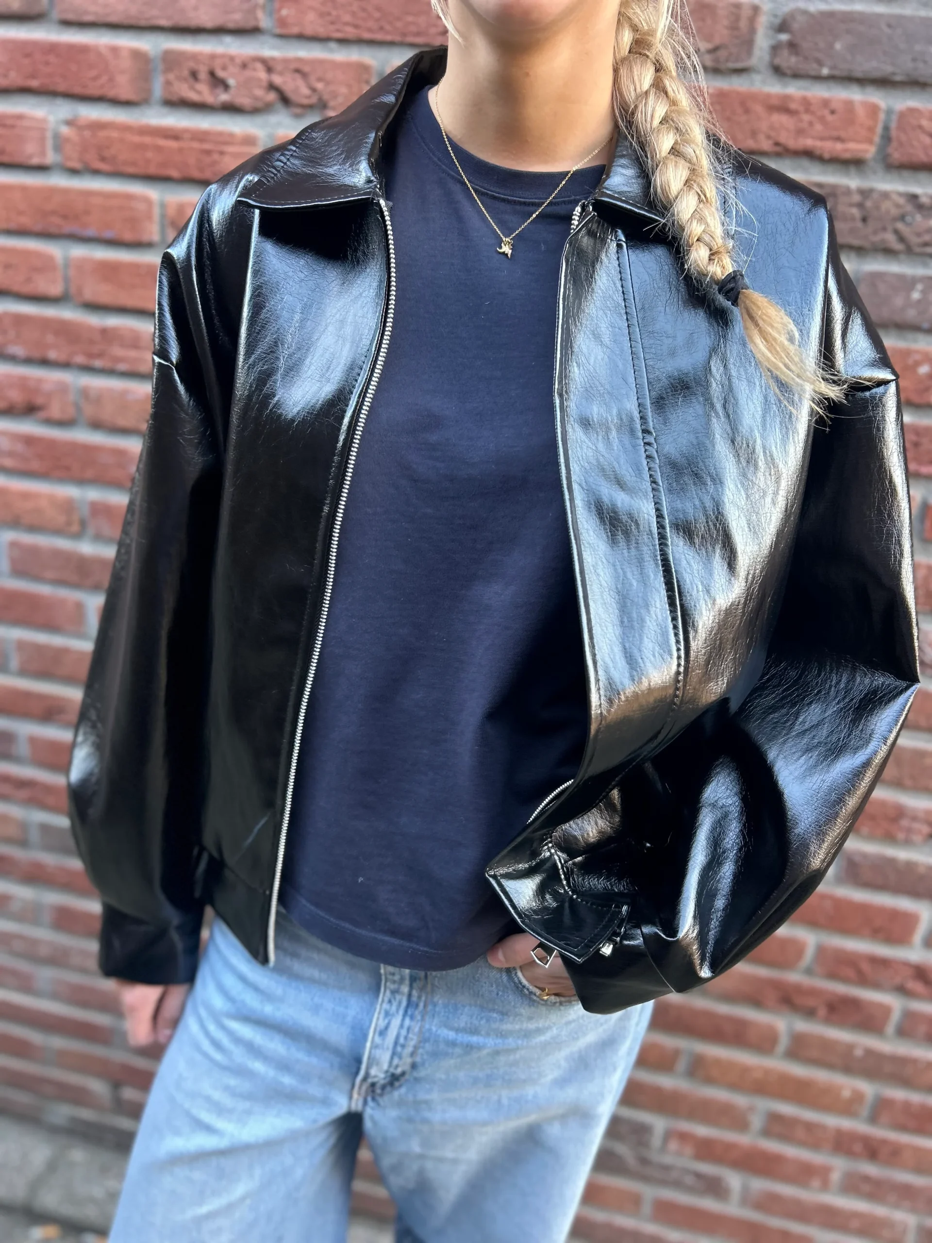 Dit lakleren jasje is perfect voor wie een statement wil maken en toch veelzijdig wil combineren. Draag het over een jurkje voor een avond uit of met jeans en sneakers voor een stoere dagelijkse look.