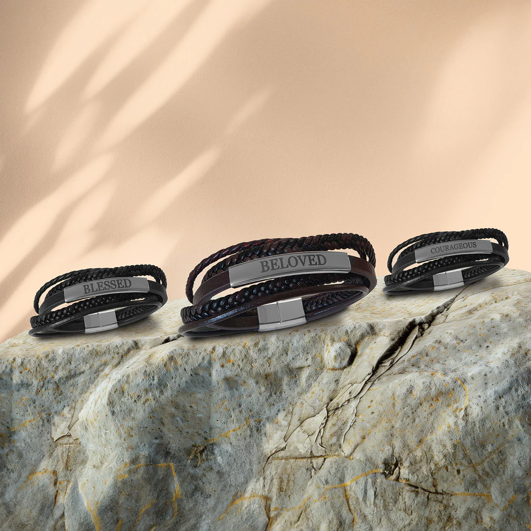 Een stoere, stevige armband van zwart leer en het woord ‘Faith’.