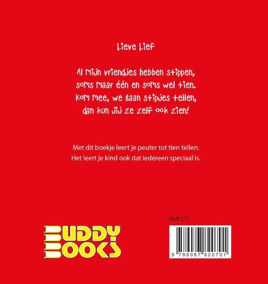 Al mijn vriendjes hebben stippen, soms maar één en soms wel tien. Kom mee, we gaan stipjes tellen, dan kun jij ze zelf ook zien! Met dit boekje leert je peuter tot tien tellen. Het leert je kind ook dat iedereen speciaal is.