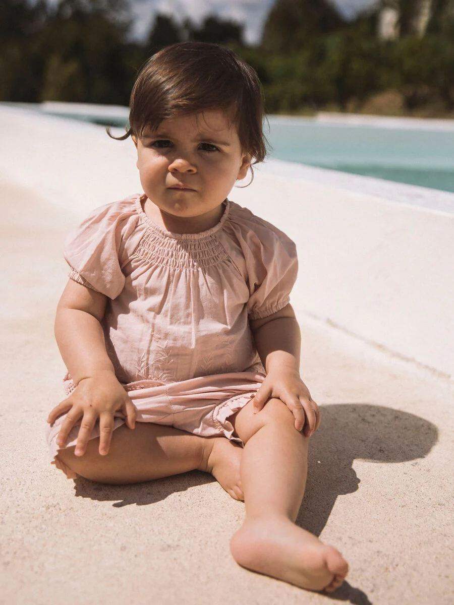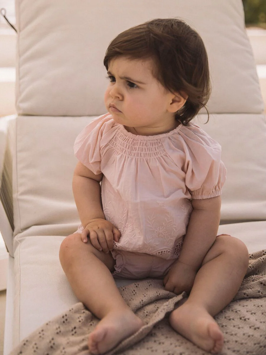 Zomerse tuniek blouse voor baby meisjes en dreumesen van biologisch katoen. De top heeft prachtige broderie anglaise details in de stof. De zacht roze top van Lil’Atelier heeft een ronde hals met smokwerk en korte mouwen. Echt een plaatje deze top!
