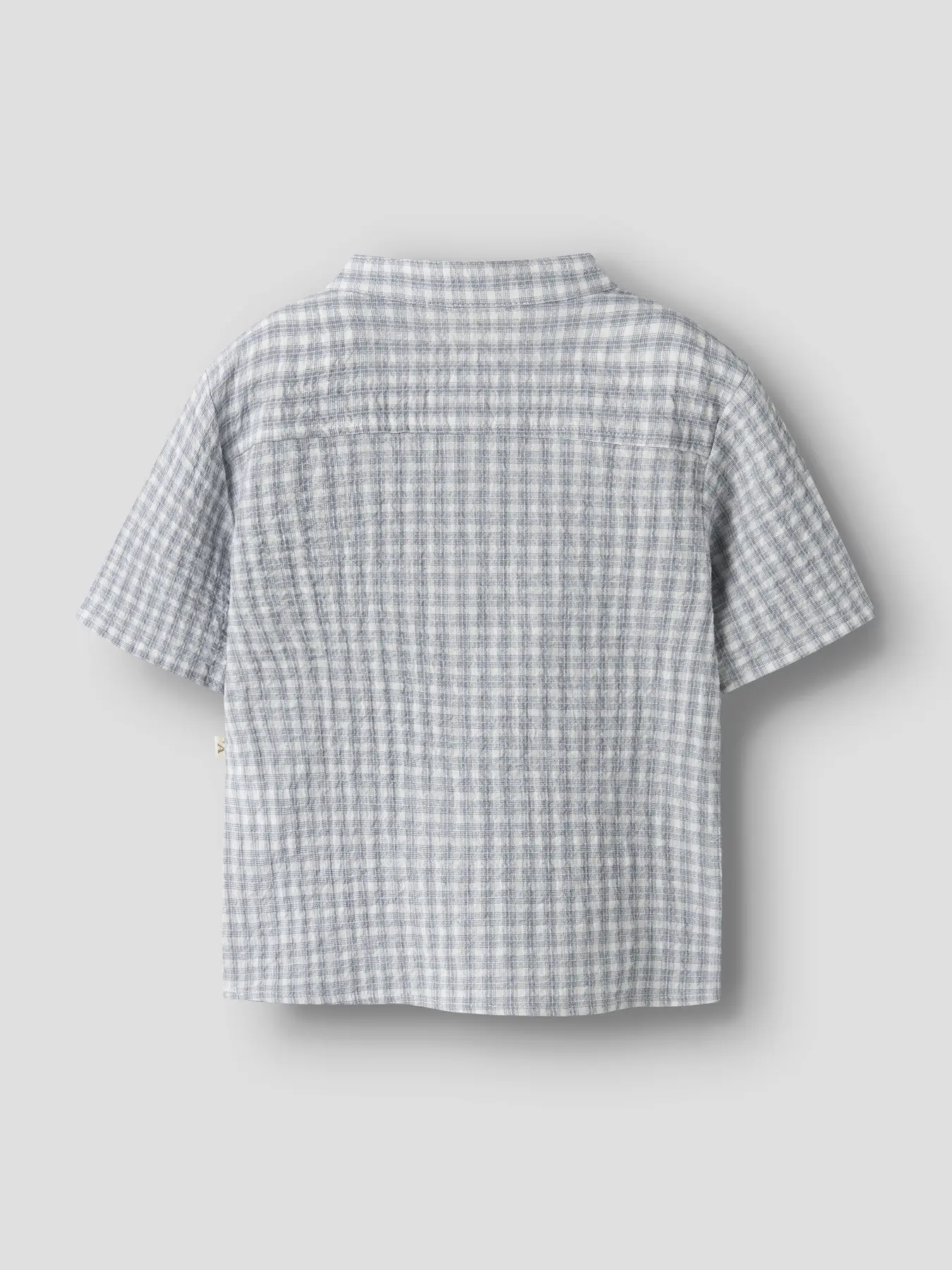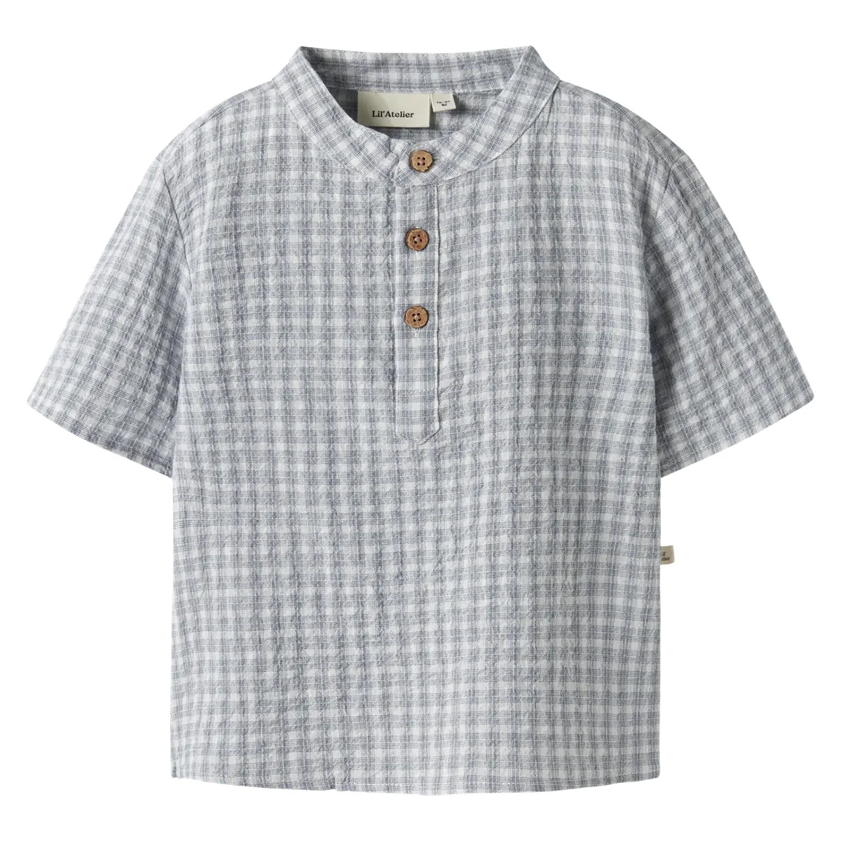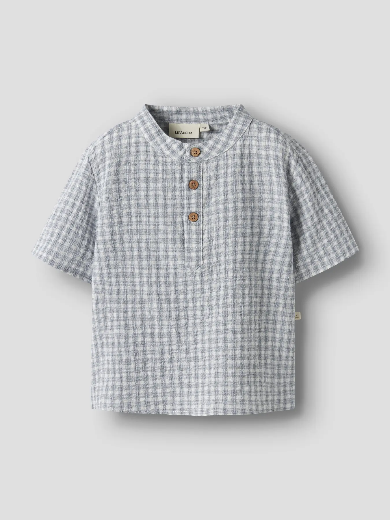 Geweven blauw geruite blouse met mandarijn kraag en korte mouwen van Lil Atelier.