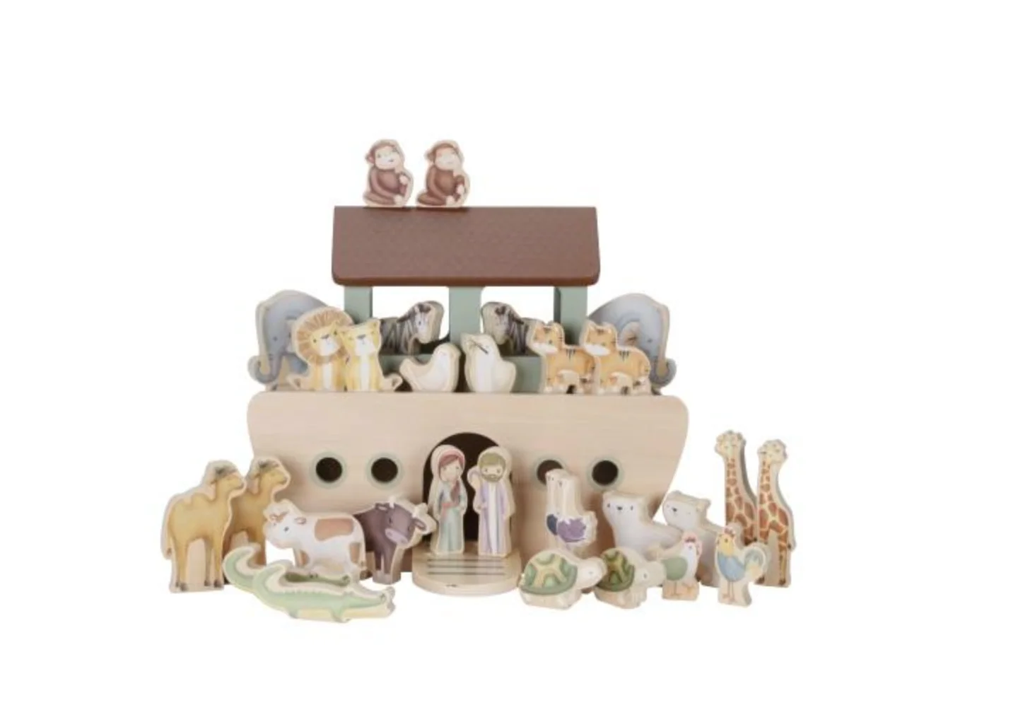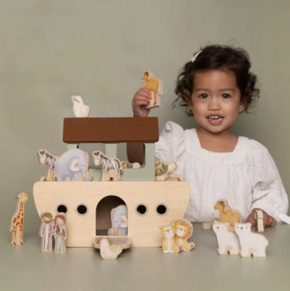Deze 25-delige set bevat de Ark met een deur, een dek dat omhoog kan worden gelift om alle dieren aan boord te brengen. Noah neemt zijn vrouw en een grote groep dieren mee op reis over de oceaan: 2 leeuwen, 2 olifanten, 2 zebra’s, 2 apen, 2 duiven, 2 krokodillen, 2 schildpadden, 2 giraffen, 2 struisvogels, 2 koeien, een kip en een haan. Deze speelset van de Ark van Noach moedigt rollenspellen aan, en verbetert de fantasie en woordenschat, terwijl je kindje dit klassieke verhaal leert.