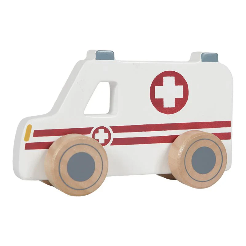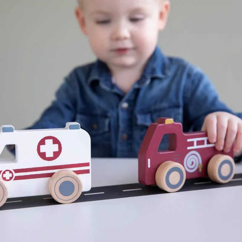 Táátúú! Heeft er iemand hulp nodig? De Little Dutch hulpdiensten komen er vliegensvlug aan! Met deze bijzondere voertuigen leren kinderen via rollenspel samenwerken en hulp bieden aan anderen. De set bestaat uit een ambulance, een politiewagen en een brandweerauto, gemaakt van stevig hout.