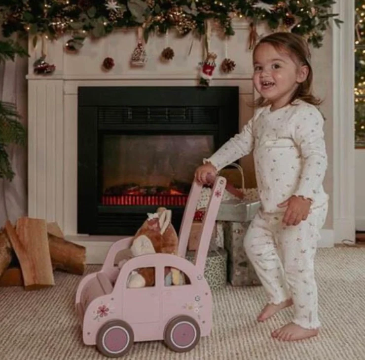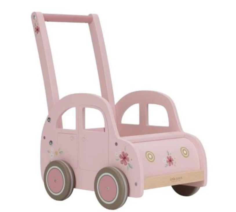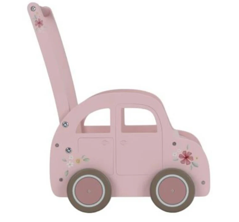 Een stijlvol ritje vol speelplezier! Deze roze houten wagen met subtiele bloemendetails en een vleugje vintage charme is perfect voor kleine avonturiers. Je kindje kan het wagentje vullen met knuffels, blokken of ander speelgoed en het zelf vooruit duwen. Zo wordt het speelgoed handig opgeborgen én meegenomen tijdens het spel. Of het nu een theekransje is met poppen of een rondje langs alle knuffels in huis – de mogelijkheden zijn eindeloos. Dankzij de rubberen strips om de wielen blijft je vloer beschermd tijdens elk ritje.