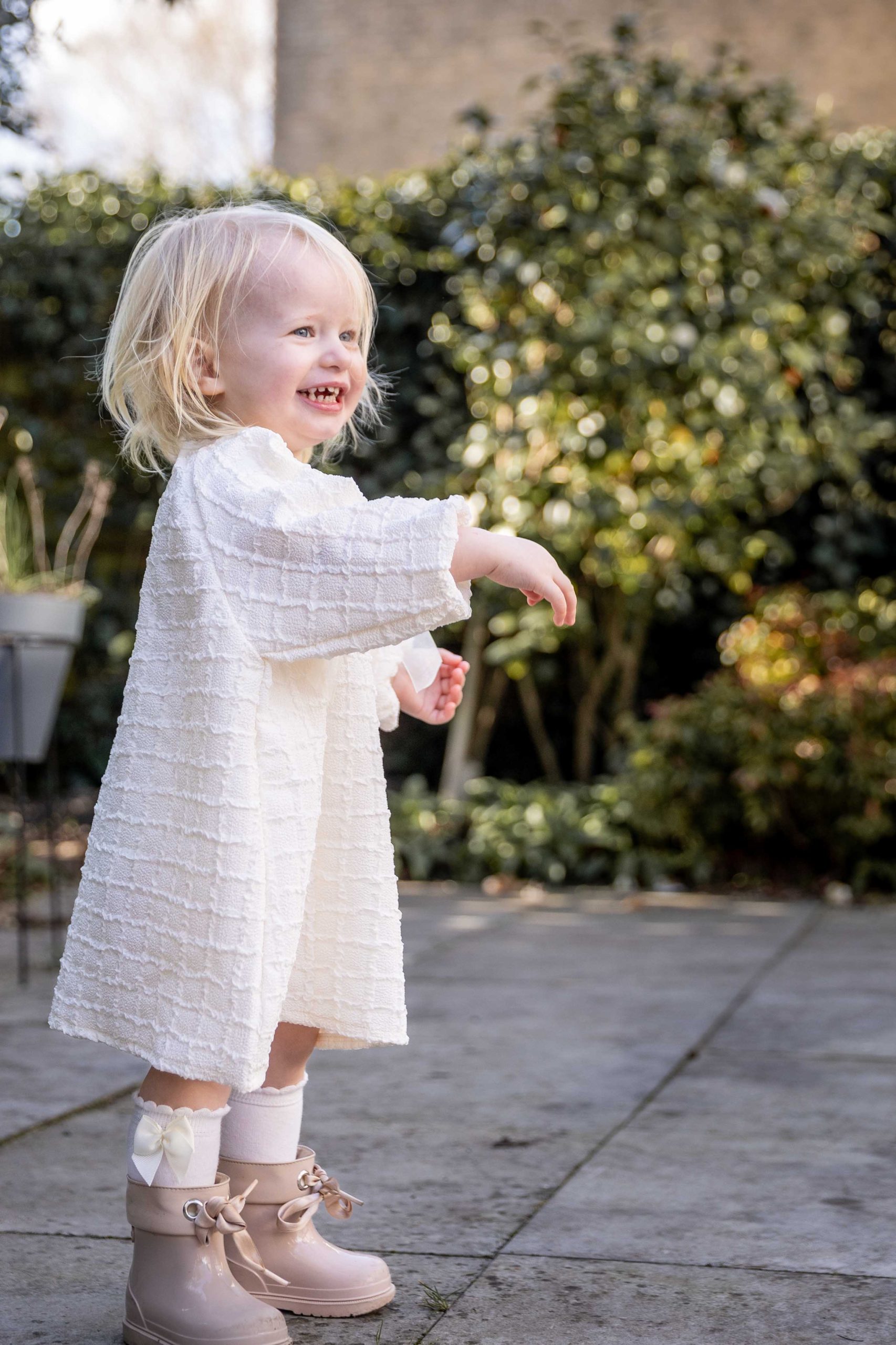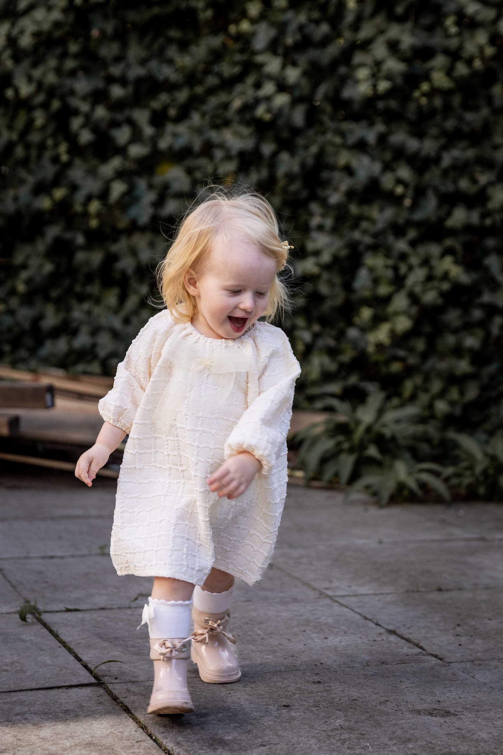 Kort, wijd vallend jurkje met prachtige geruite details in de stof en een tule strik bij de hals. De hals is elastisch en verder is de een wijd model. Jurkje Margaret is beschikbaar in de kleur ivory en lichtgeel.
