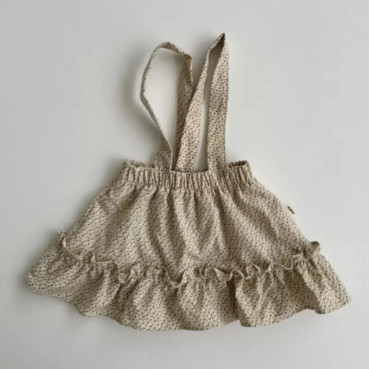 Schattig rokje met bretels met een rustige bloemenprintje. De bretels bevestig je midden achter middels een knoop.