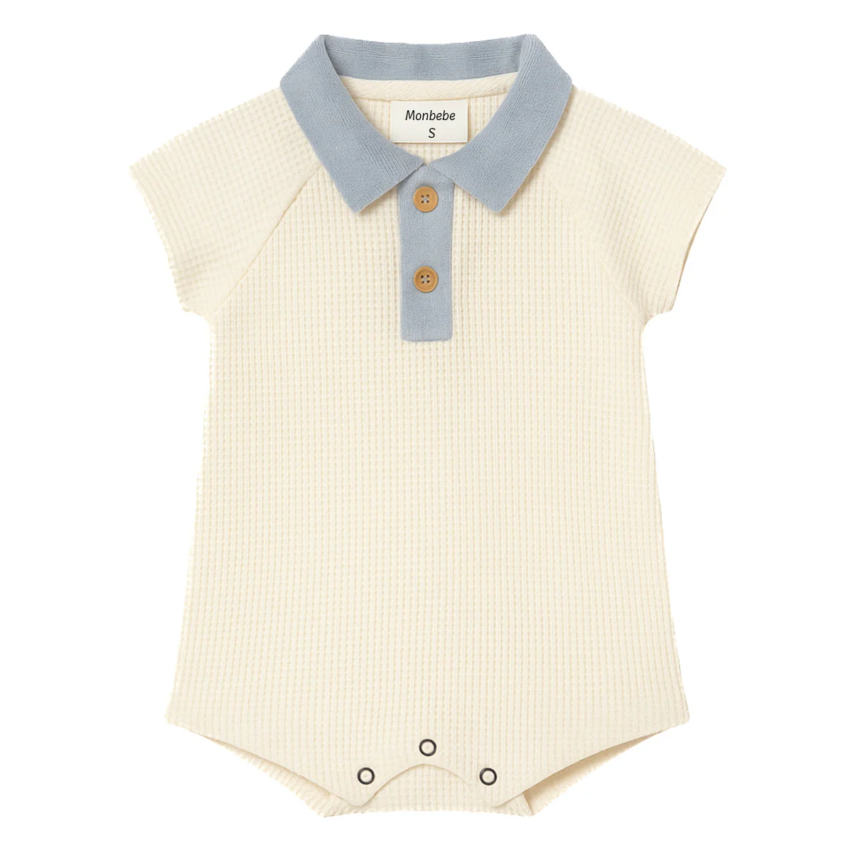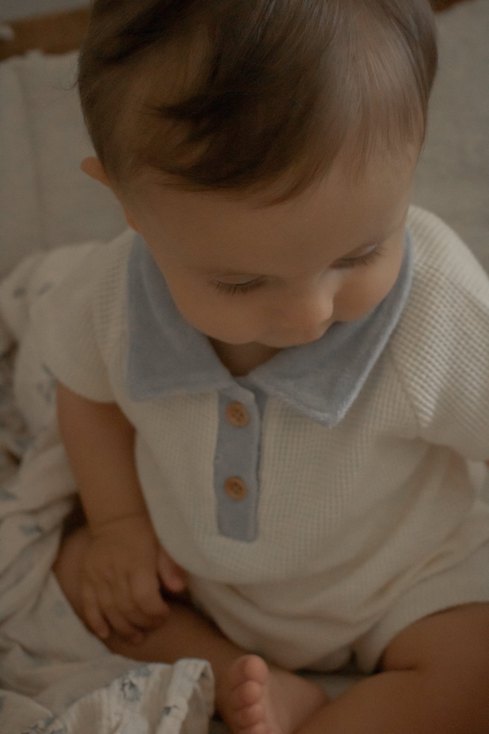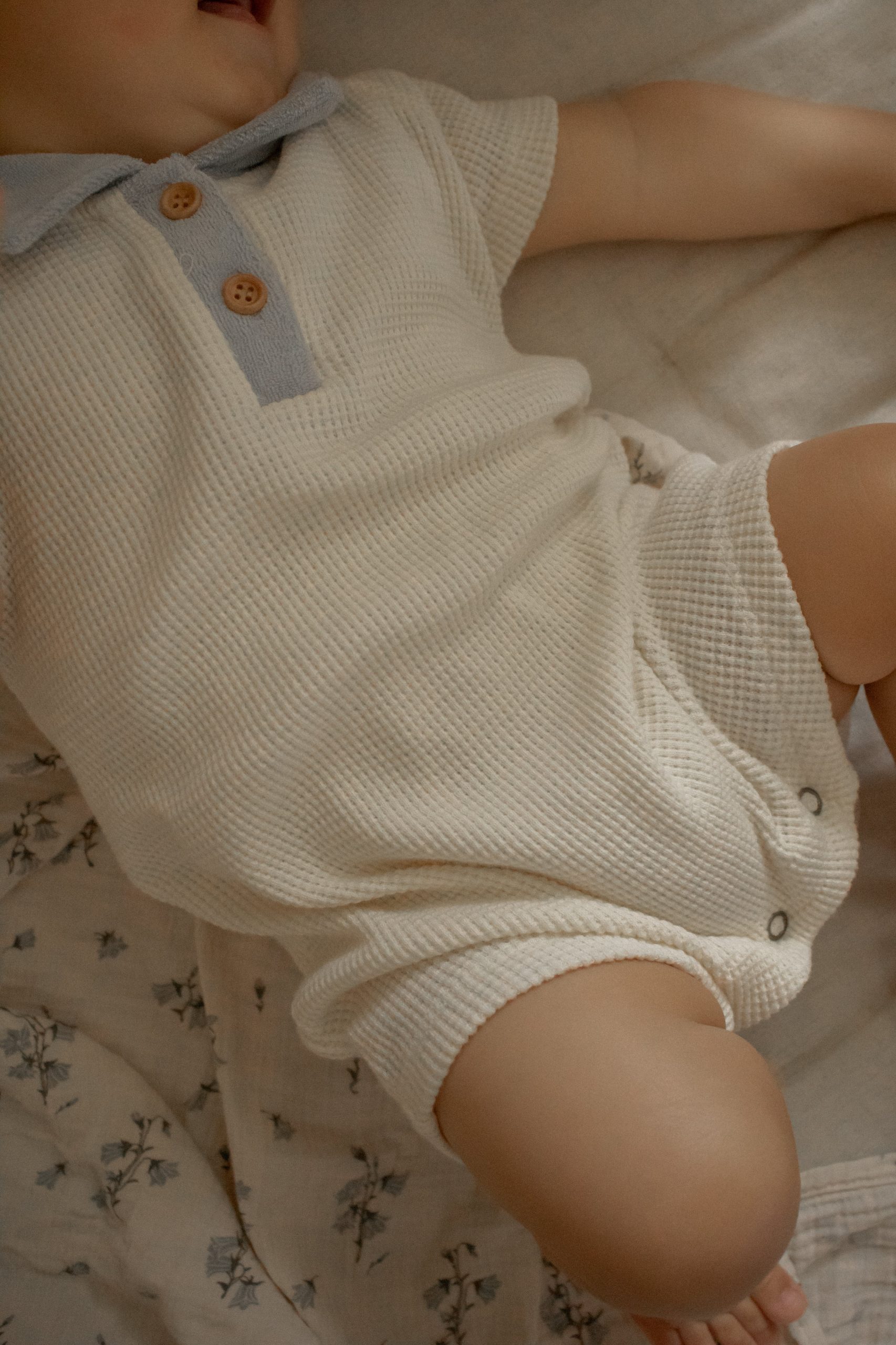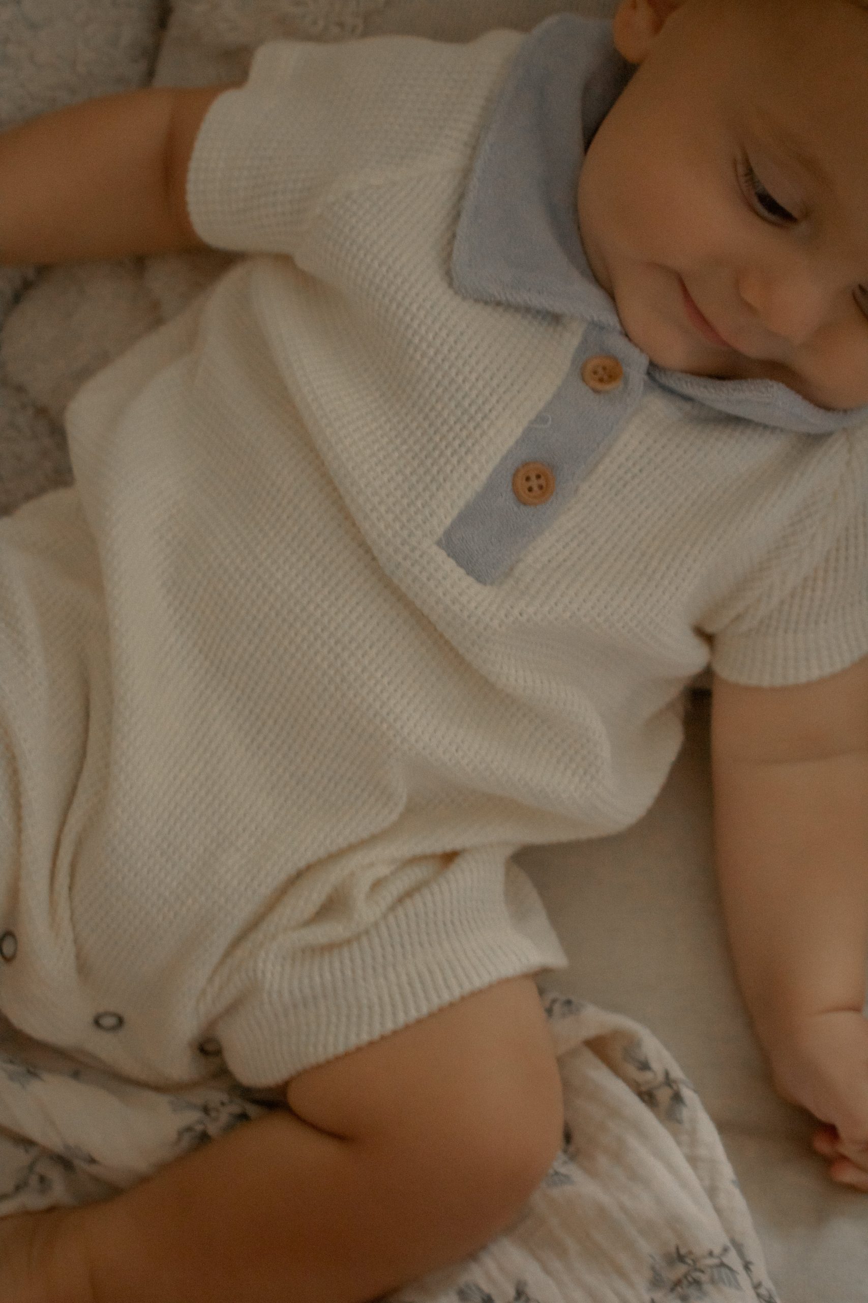 Suit Harry van het Koreaanse merk Monbebe een heerlijk pakje voor jouw zomer baby. Dit eendelige set voor jongens is gemaakt van wafelstof en heeft een lichtblauwe kraag van badstof. De romper heeft een klein mouwtje en hele korte broekspijpen. Heerlijk zomers.