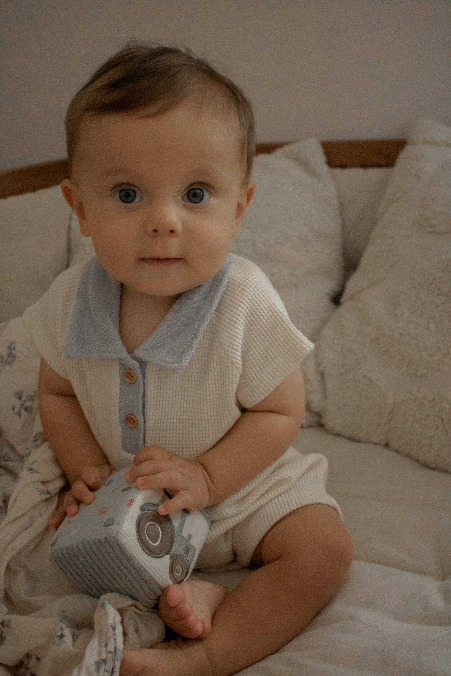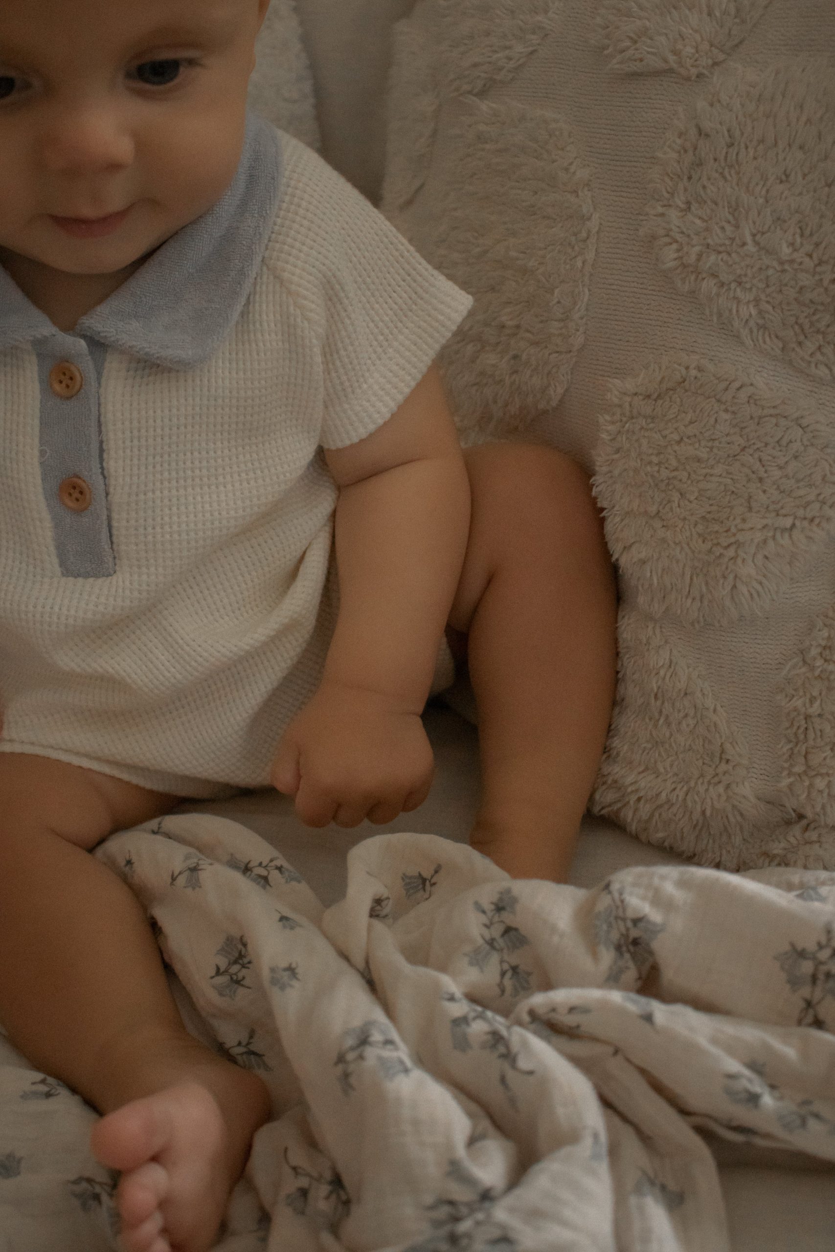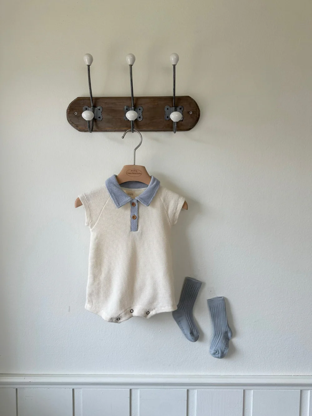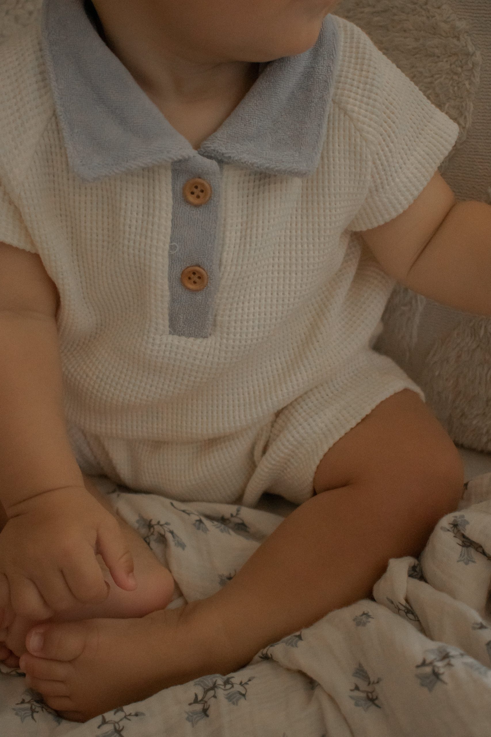 Suit Harry van het Koreaanse merk Monbebe een heerlijk pakje voor jouw zomer baby. Dit eendelige set voor jongens is gemaakt van wafelstof en heeft een lichtblauwe kraag van badstof. De romper heeft een klein mouwtje en hele korte broekspijpen. Heerlijk zomers.