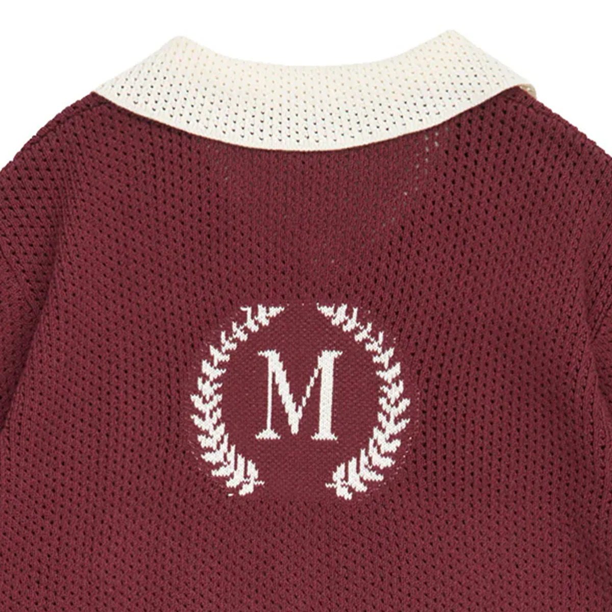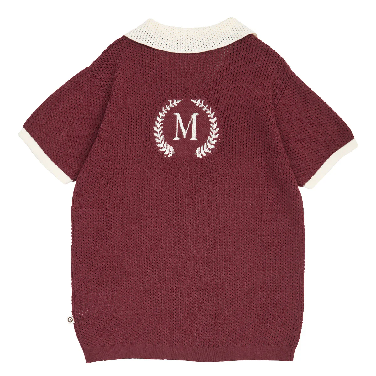 Sportieve jongens polo met korte mouwen in clubhouse stijl. De polo heeft een offwhite kraag en boorden bij de mouwen. De kleur russet is ook wel wijnrood, burgundy of bordeaux rood te noemen. De gebreide polo heeft een borduursel van de letter M op de rug.