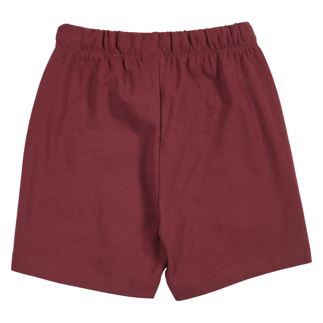 Mooie effen shorts van zachte en elastische single jersey. Met elastiek in de taille. Sportieve pasvorm voor stoere jongens. De kleur russet is ook wel wijnrood, burgundy of bordeaux rood te noemen.