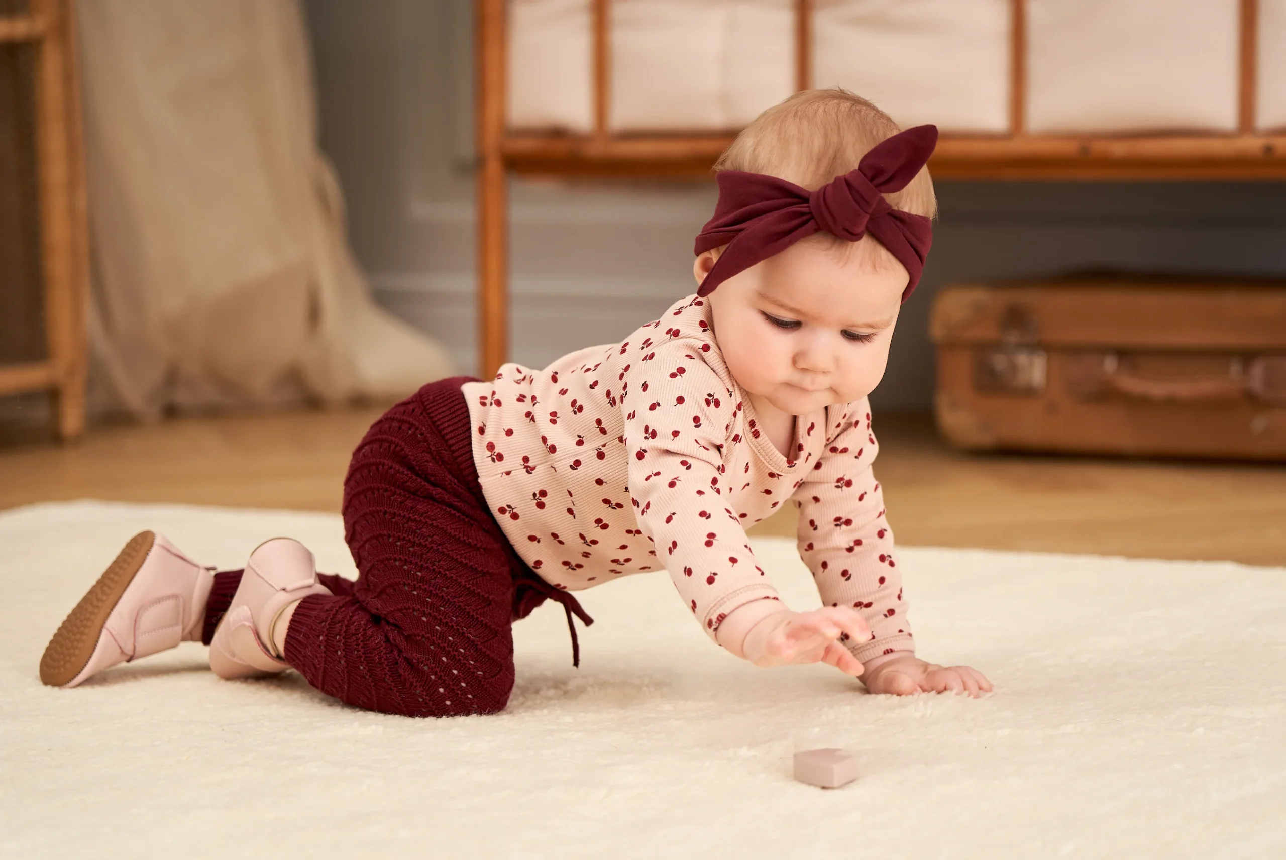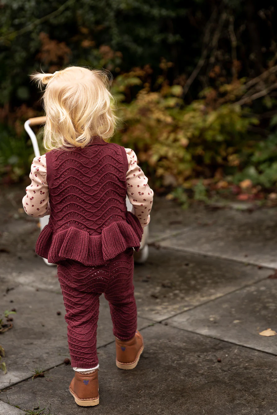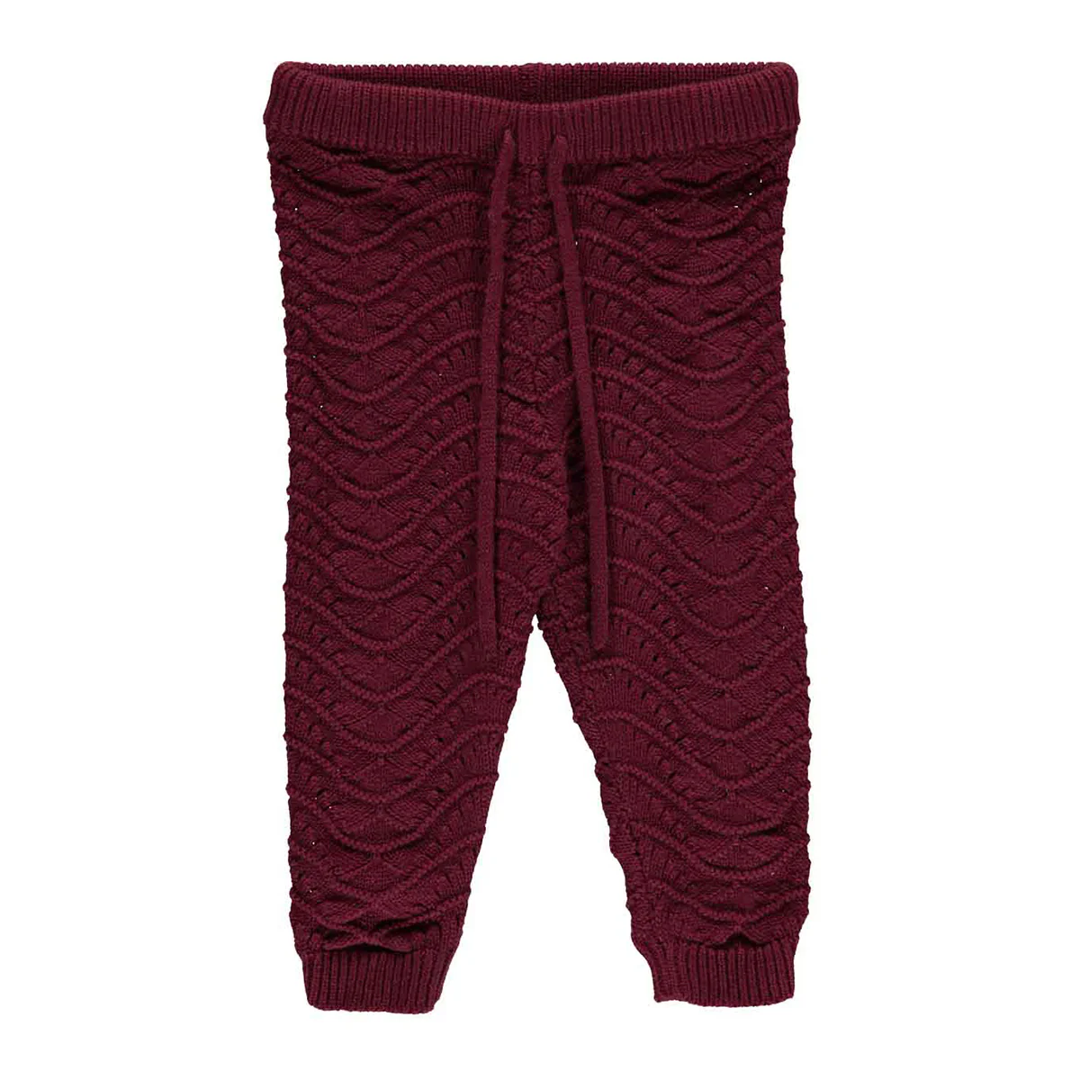 Heerlijk zacht gebreide broek voor baby meisjes. Elastisch (met strikbandjes) in de taille, en fijn gebreide kwaliteit met mooie details.