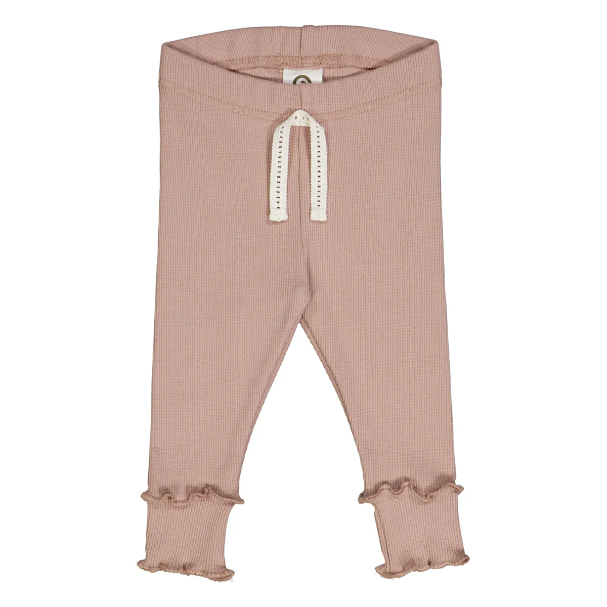 Leuke babylegging voor meisjes in de kleur rose wood (oudroze). De legging heeft een elastische taille, het strikje zit er voor de sier. De broekspijpen van de legging hebben subtiele ruches. De stof is een fijne rib wat zorgt voor een exclusieve look.
