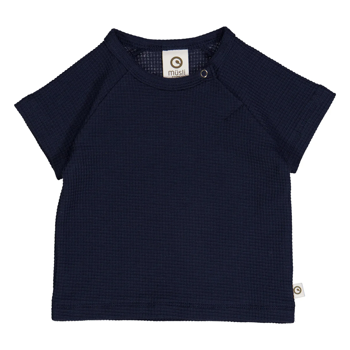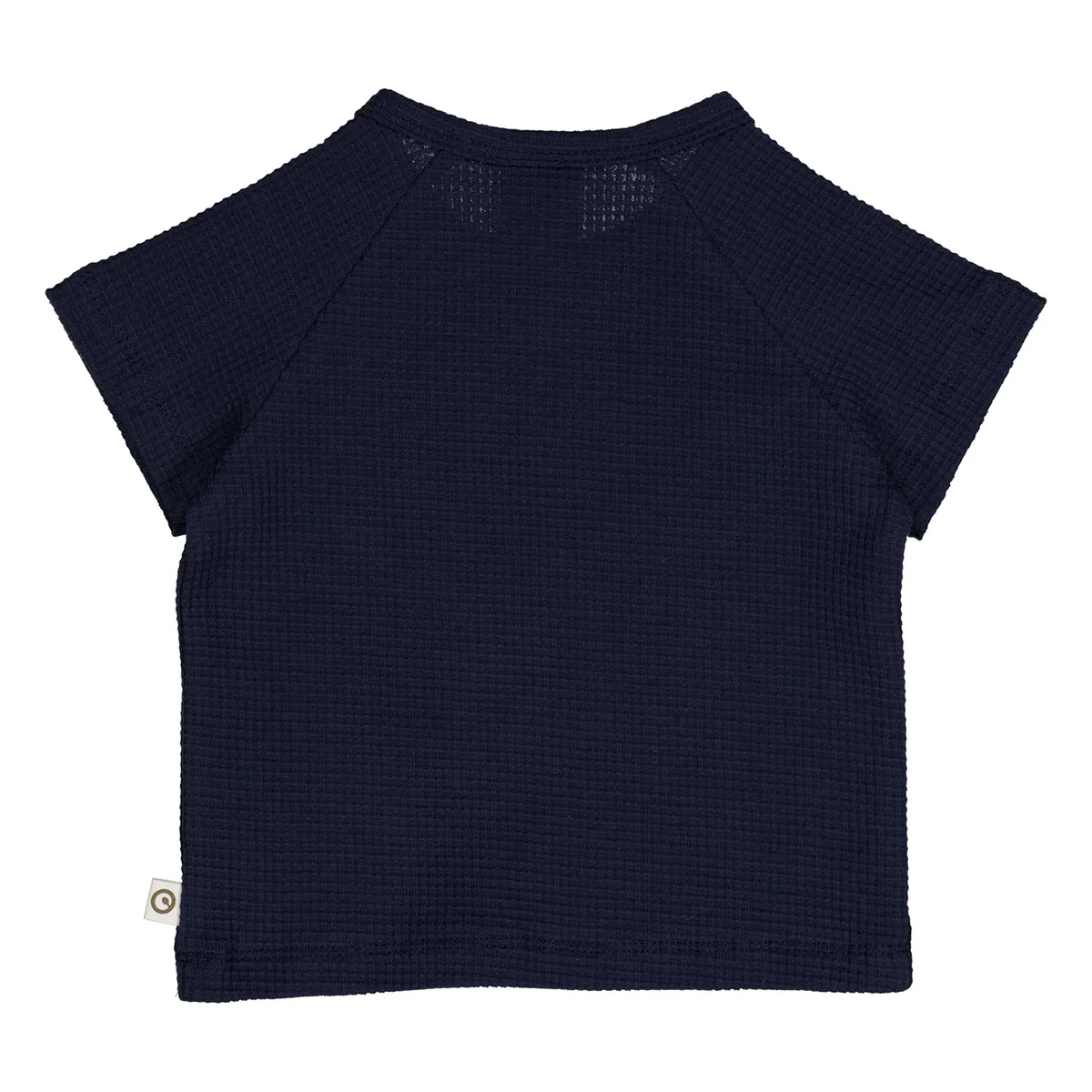 Shirt van wafelstof in de kleur night blue (marineblauw). Dit shirt heeft een raglanmouw. Een raglanmouw geeft door de diagonale naad meer bewegingsruimte en dus meer speelvrijheid. Op een zomer vol plezier!