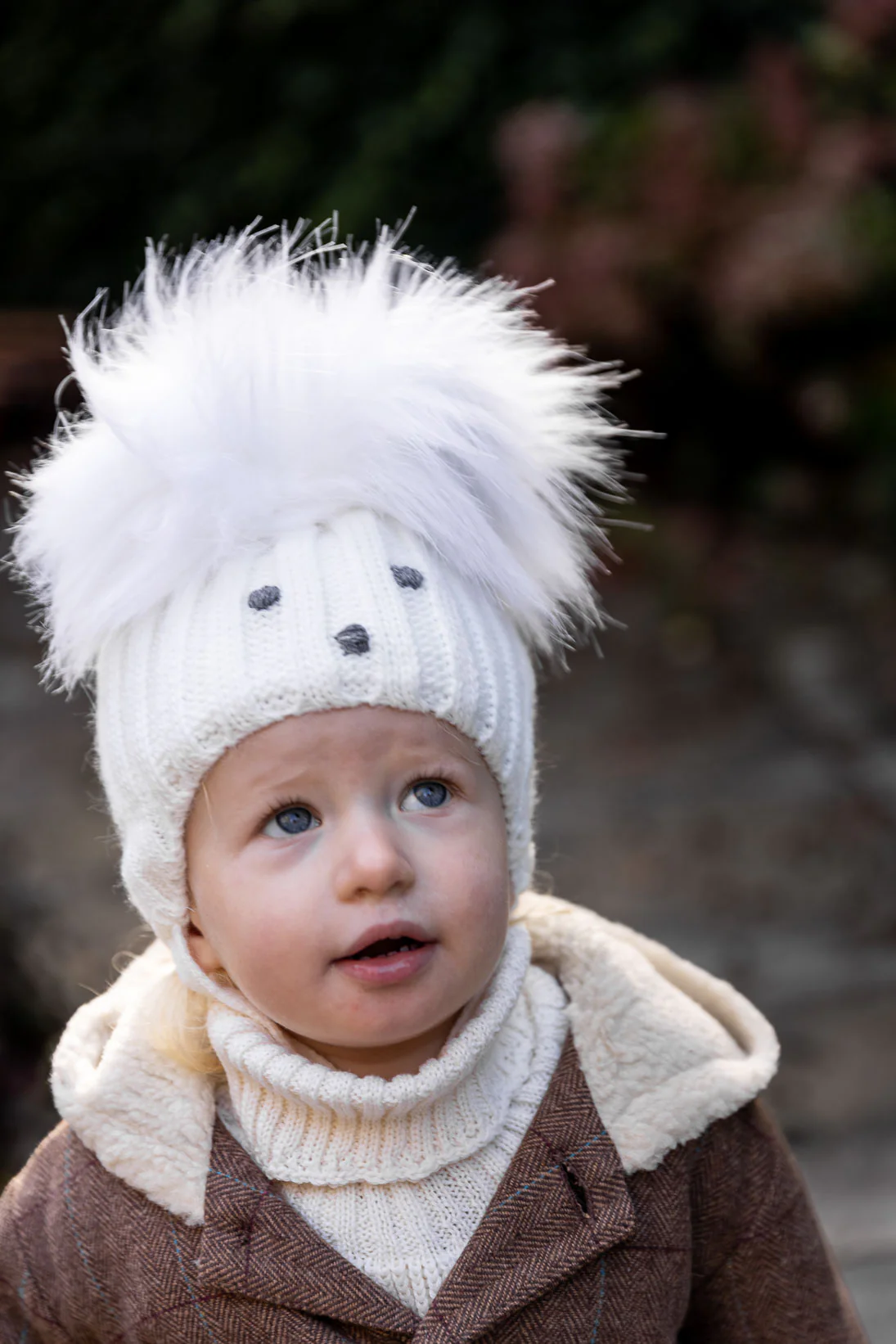 Deze crèmekleurige muts met dierengezichtje is ook beschikbaar in de kleur beige.