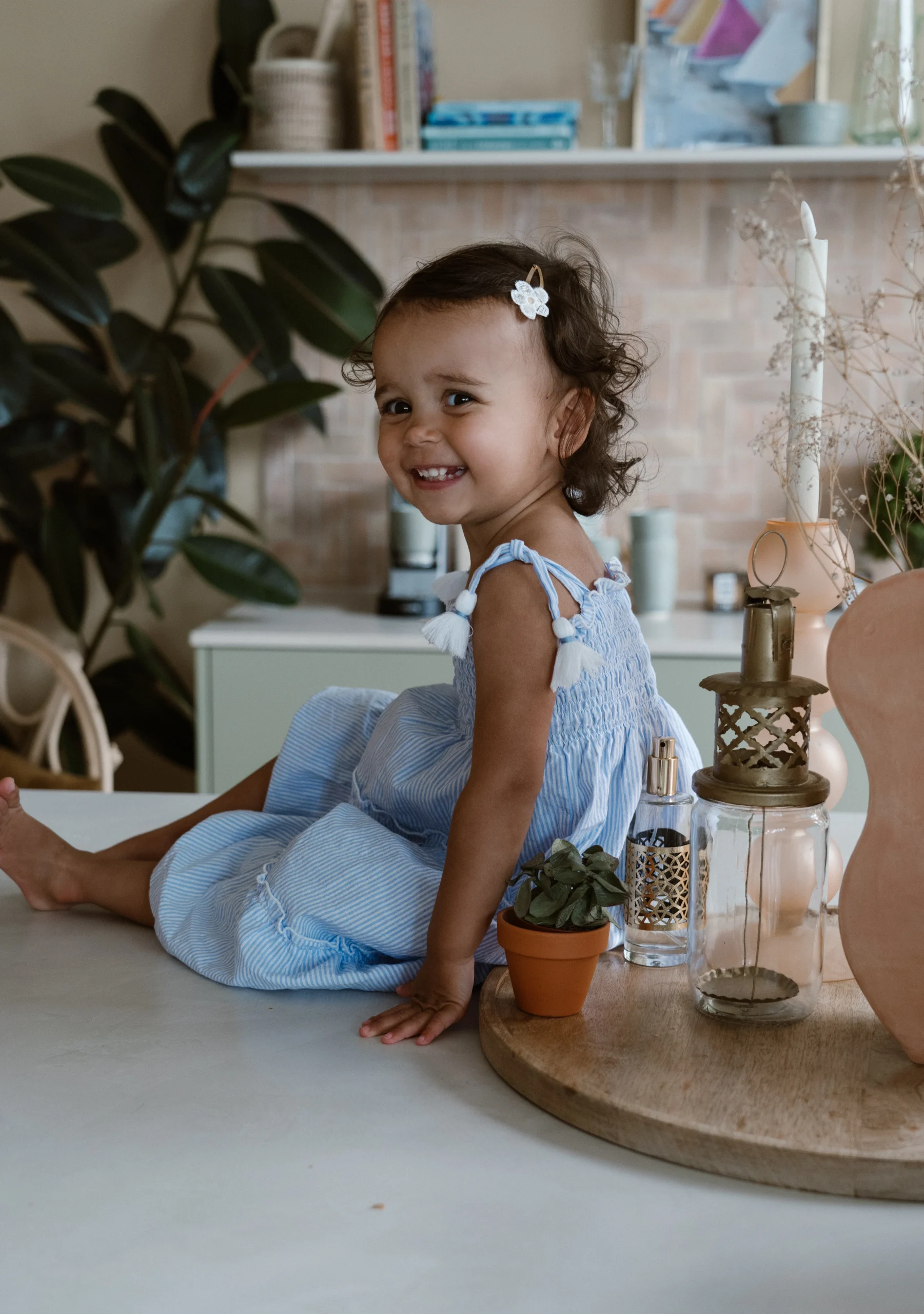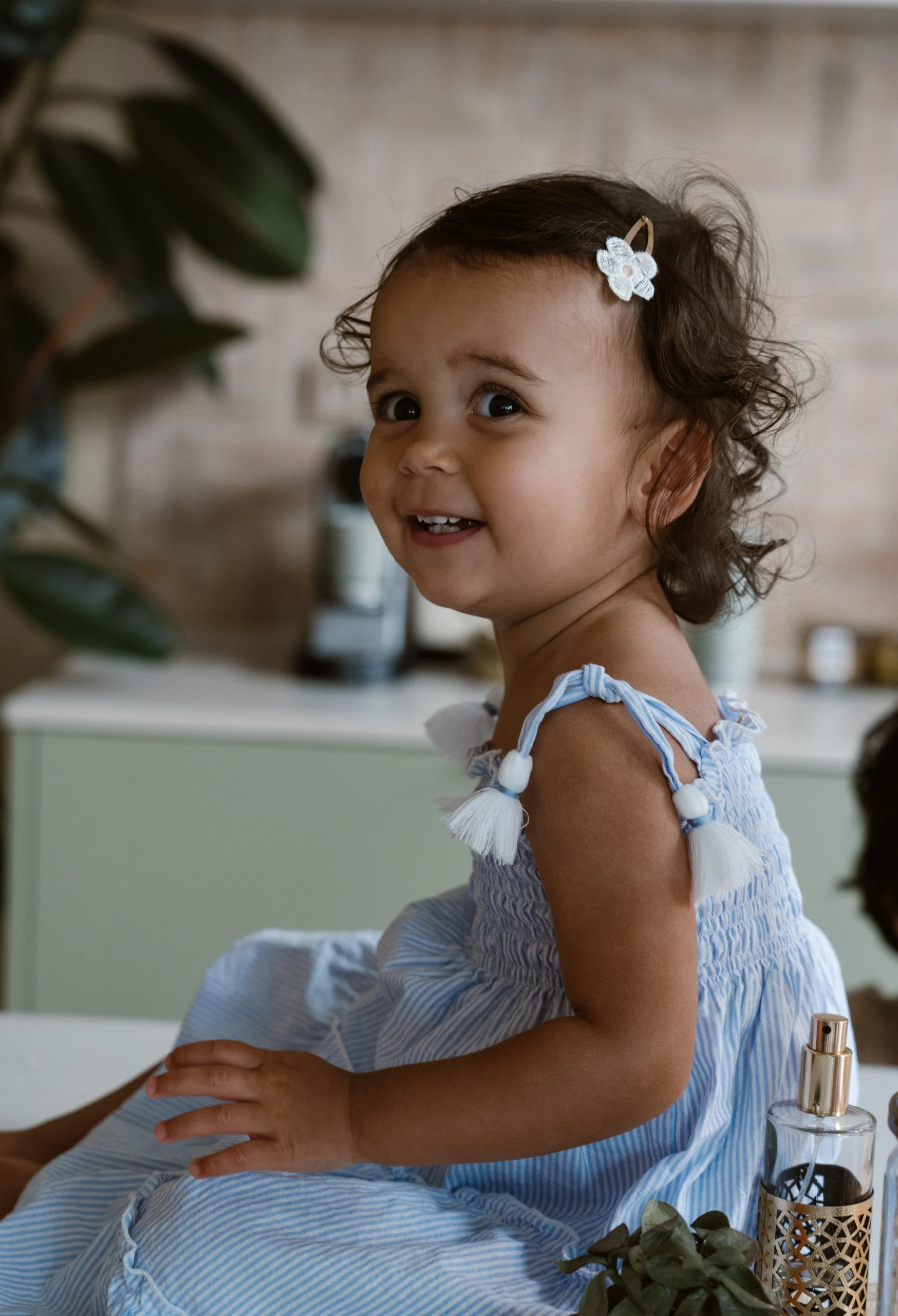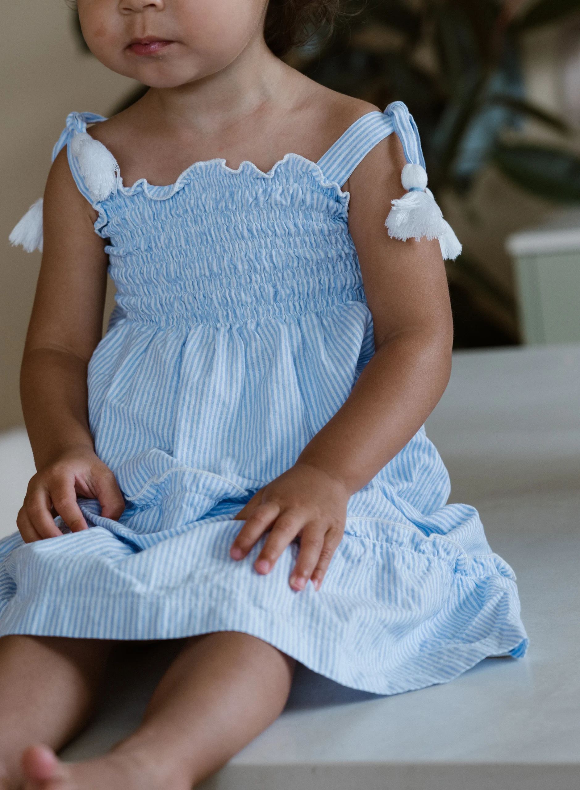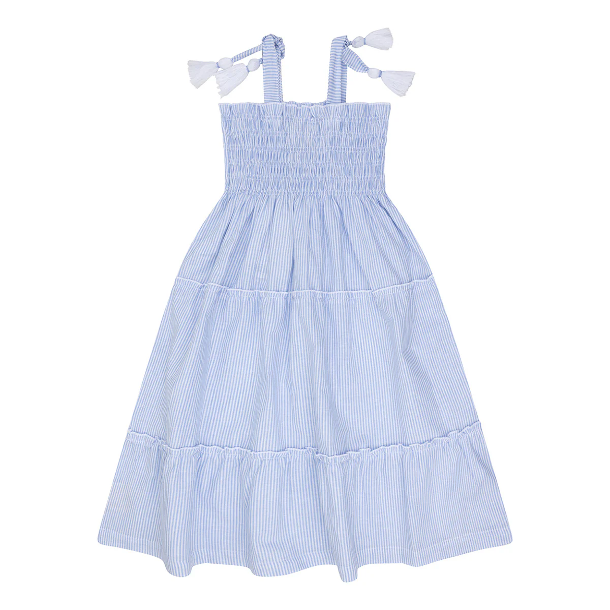 Een super leuk, nieuw design van Navy Natural. Een heerlijk zomers jurkje. Lichtblauw gestreept met striksluiting op de schouders. De linten hebben leuke kwastjes bij de uiteinden.