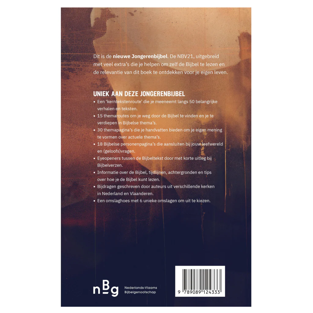 Zeer uitgebreide Jongerenbijbel bij de NBV21, met bijdragen die geschreven zijn door een interconfessioneel team van auteurs. De Bijbel verschijnt in samenwerking met de jongerenorganisaties BEAM, HGJB, IJD, MOVE en WAY. Deze nieuwe Jongerenbijbel helpt jongeren om zelf de Bijbel te lezen en de relevantie van dit boek te ontdekken voor hun eigen leven. De Jongerenbijbel bevat veel extra content zoals themaroutes, personenpagina’s en themapagina’s. Daarmee is deze Jongerenbijbel een gids die je helpt om je mening te vormen over actuele thema’s en te groeien in je geloof. Uniek aan deze Jongerenbijbel: – Bijbel met veel extra content, zoals themaroutes om je weg door de Bijbel te vinden en je te verdiepen in Bijbelse thema’s. – Met personenpagina’s en themapagina’s die aansluiten bij de leefwereld en (geloofs)vragen van jongeren van verschillende leeftijden. – Geen pasklare antwoorden, maar handvatten om zelf op zoek te gaan. – Bijdragen geschreven door een team van auteurs uit verschillende kerken in Nederland en Vlaanderen, onder wie Bram van Putten, Corine Zonnenberg, Corjan Matsinger, Ilse Visser, Pieter Both, Raymond Hausoul, Stephen van der Leij en Tabitha van Krimpen. – Jongerenbijbel bij de nieuwste Bijbelvertaling (NBV21). De inhoud van de Jongerenbijbel sluit aan bij de belevingswereld van jongeren die naar de middelbare school gaan en oudere jongeren. Extra Wordt geleverd met een hoes met 6 unieke en eigentijdse covers: 1 standaardcover en 5 covers van verschillende jongerenorganisaties. Dankzij de flexibele band slaat de Bijbel goed open.