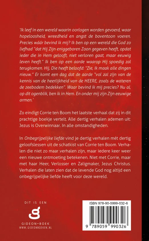 Ik leef in een wereld waarin oorlogen worden gevoerd, waar hopeloosheid, wreedheid en angst de boventoon voeren. Precies waar bevind ik mij? Ik ben op een wereld die God zo liefhad “dat Hij Zijn eniggeboren Zoon gegeven heeft, opdat een ieder die in Hem gelooft, niet verloren gaat, maar eeuwig leven heeft”. Ik ben op een aarde waarop Hij spoedig zal terugkomen. Hij, Die heeft beloofd: “Zie Ik maak alle dingen nieuwe”. Er komt een dag dat de aarde “vol zal zijn van de kennis van de heerlijkheid van de HEERE, zoals de wateren de zeebodem bedekken”. Waar bevind ik mij precies? Nu al, op dit ogenblik, ben ik in Hem. En onder mij zijn Zijn eeuwige armen.’ Zo eindigt Corrie ten Boom het laatste verhaal dat zij in dit prachtige boekje vertelt. Alle dertig verhalen ademen uit: Jezus is Overwinnaar. In alle omstandigheden. In Onbegrijpelijke liefde vind je dertig verhalen mét dertig geloofslessen uit de schatkist van Corrie ten Boom. Verhalen die niet zo maar verhalen zijn, maar iedere keer weer een nieuwe ontmoeting betekenen. Niet met Corrie, maar met haar Heer, Verlosser en Zaligmaker, Jezus Christus. Verhalen die laten zien dat de levende God nog altijd een onbegrijpelijke liefde heeft voor deze wereld.